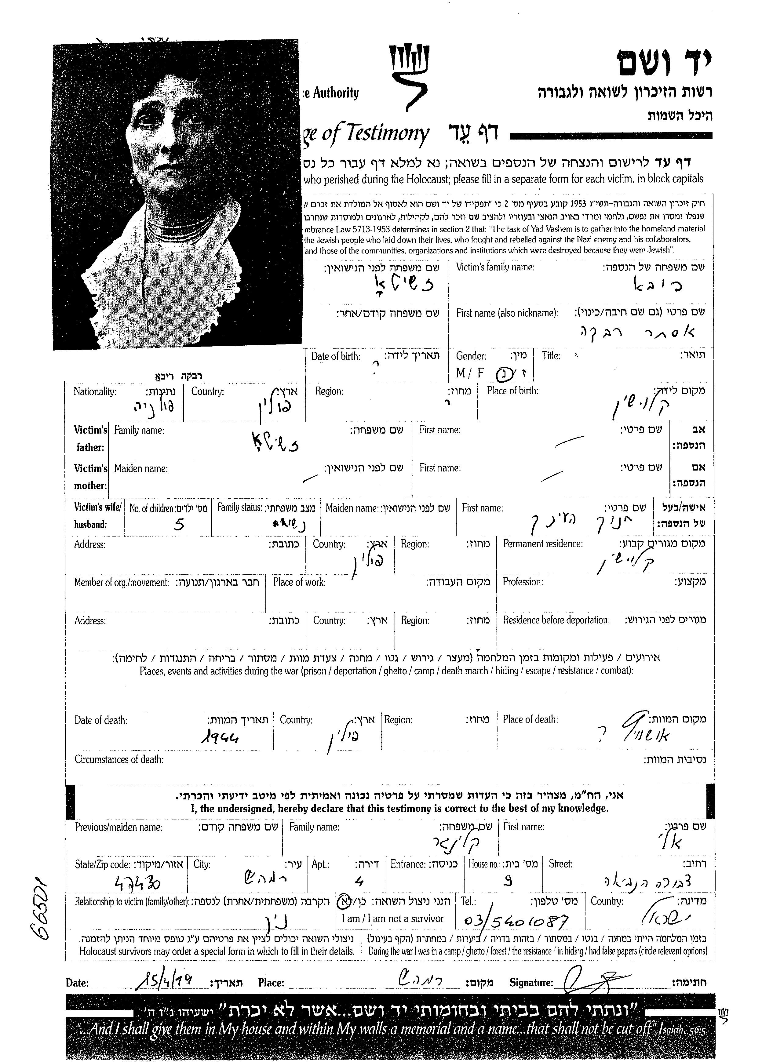 Ryba | Ester Rivka | Kalushin, Polen | Gedenkblatt | |