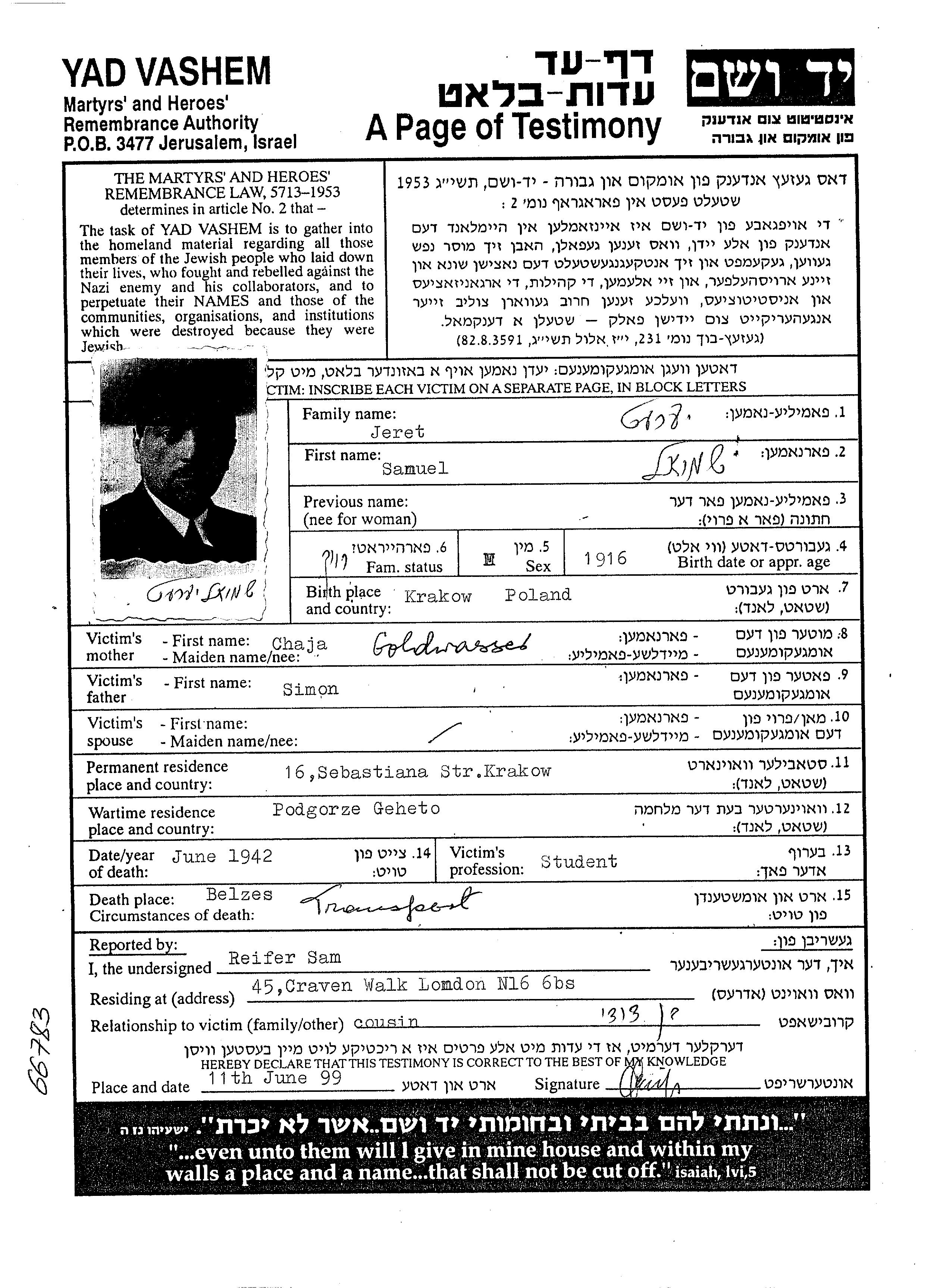 Shmuel Jeret wurde im Jahr 1916 in Krakow, Polen geboren. Er war Student. Vor dem Zweiten Weltkrieg lebte er in Krakow, Polen.