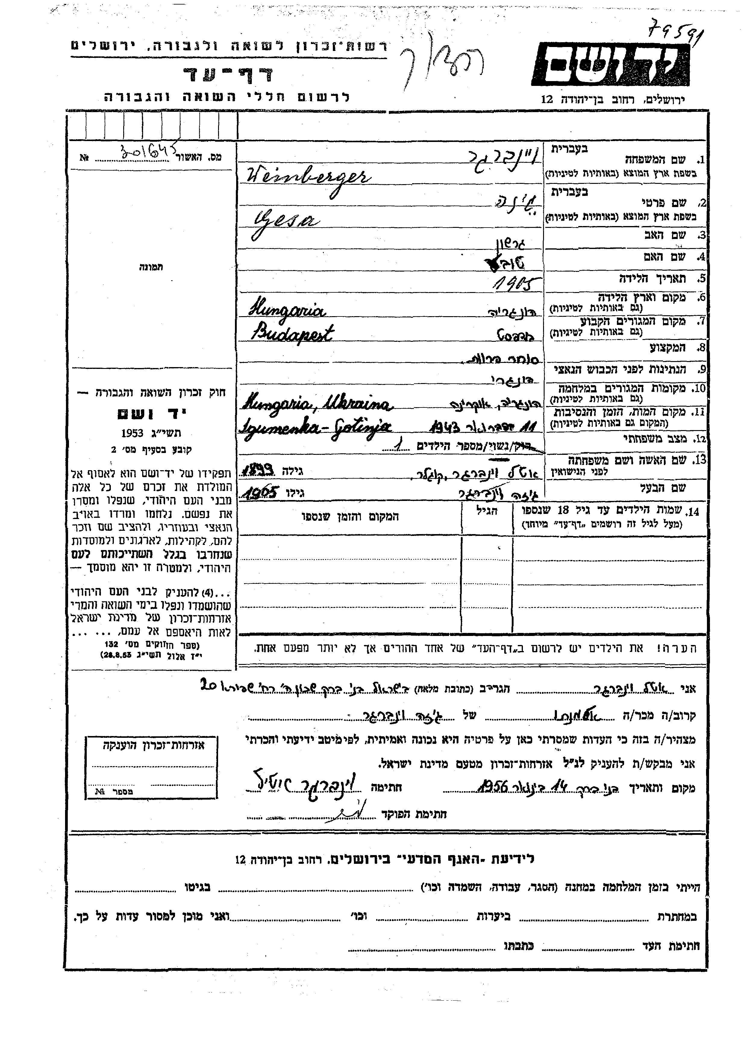 Geza Weinberger wurde im Jahr 1905 in Satoraljaujhely, Ungarn geboren. Er war Kürschner/-in. Vor dem Zweiten Weltkrieg lebte er in Budapest, Ungarn.