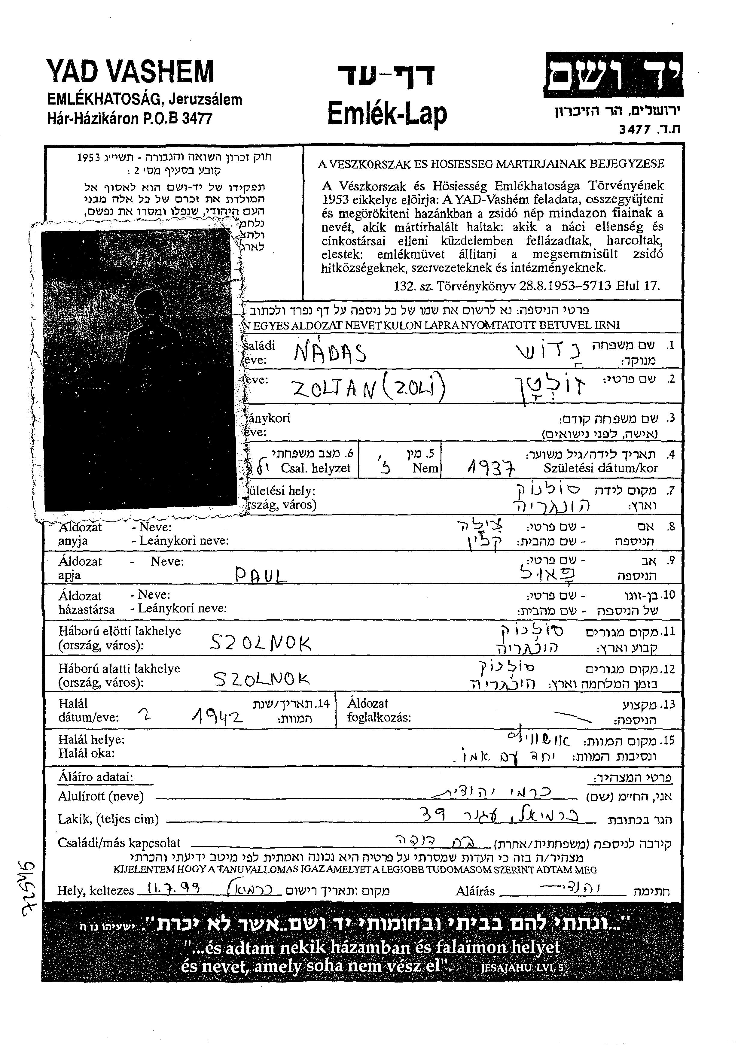 Zoli Nadas Nadosh wurde im Jahr 1937 in Szolnok, Ungarn geboren. Vor dem Zweiten Weltkrieg lebte er in Szolnok, Ungarn.