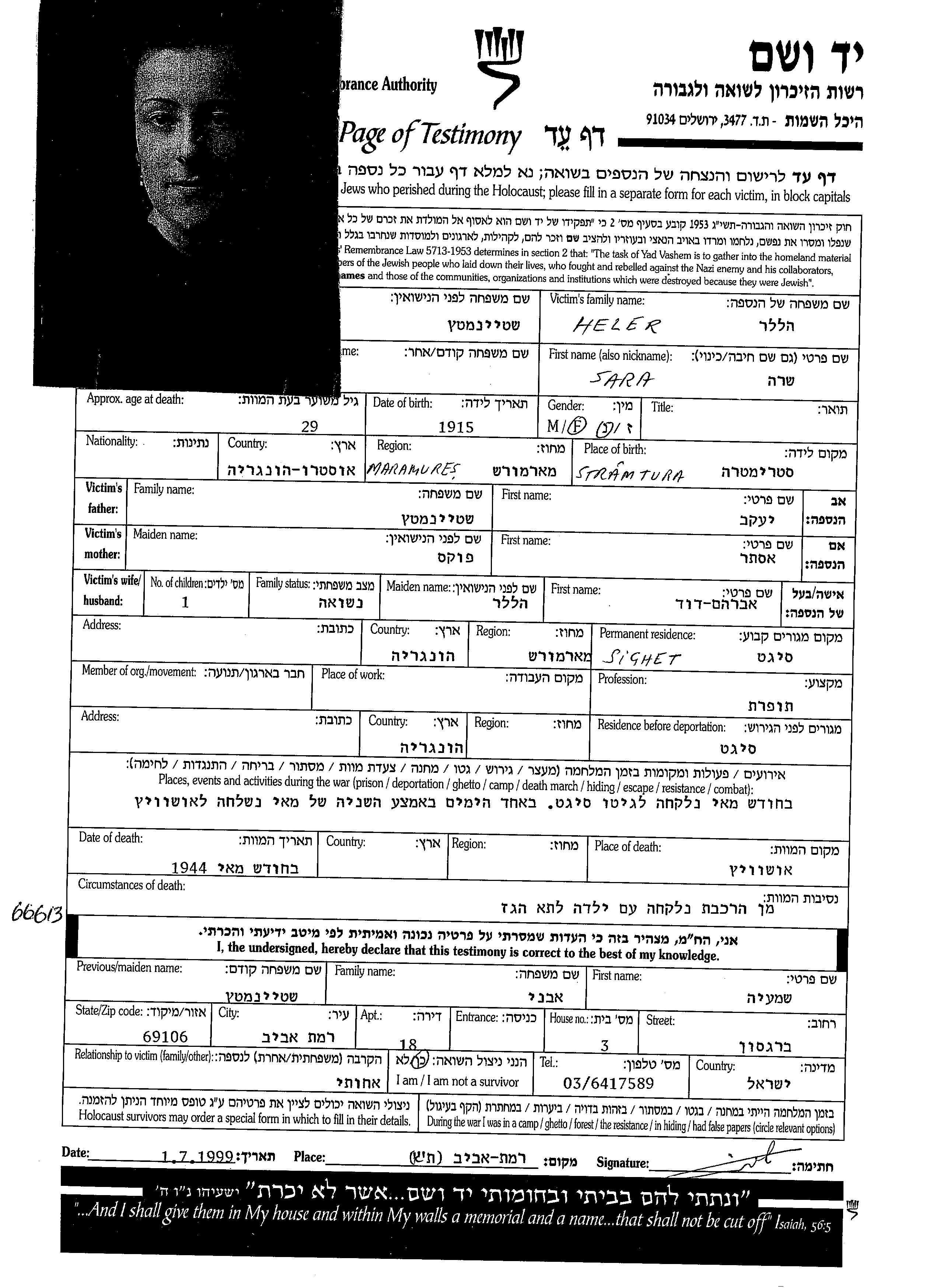 Sara Heler wurde im Jahr 1915 in Stramtura, Rumänien geboren. Sie war Schneiderin. Vor dem Zweiten Weltkrieg lebte sie in Sighet, Rumänien.