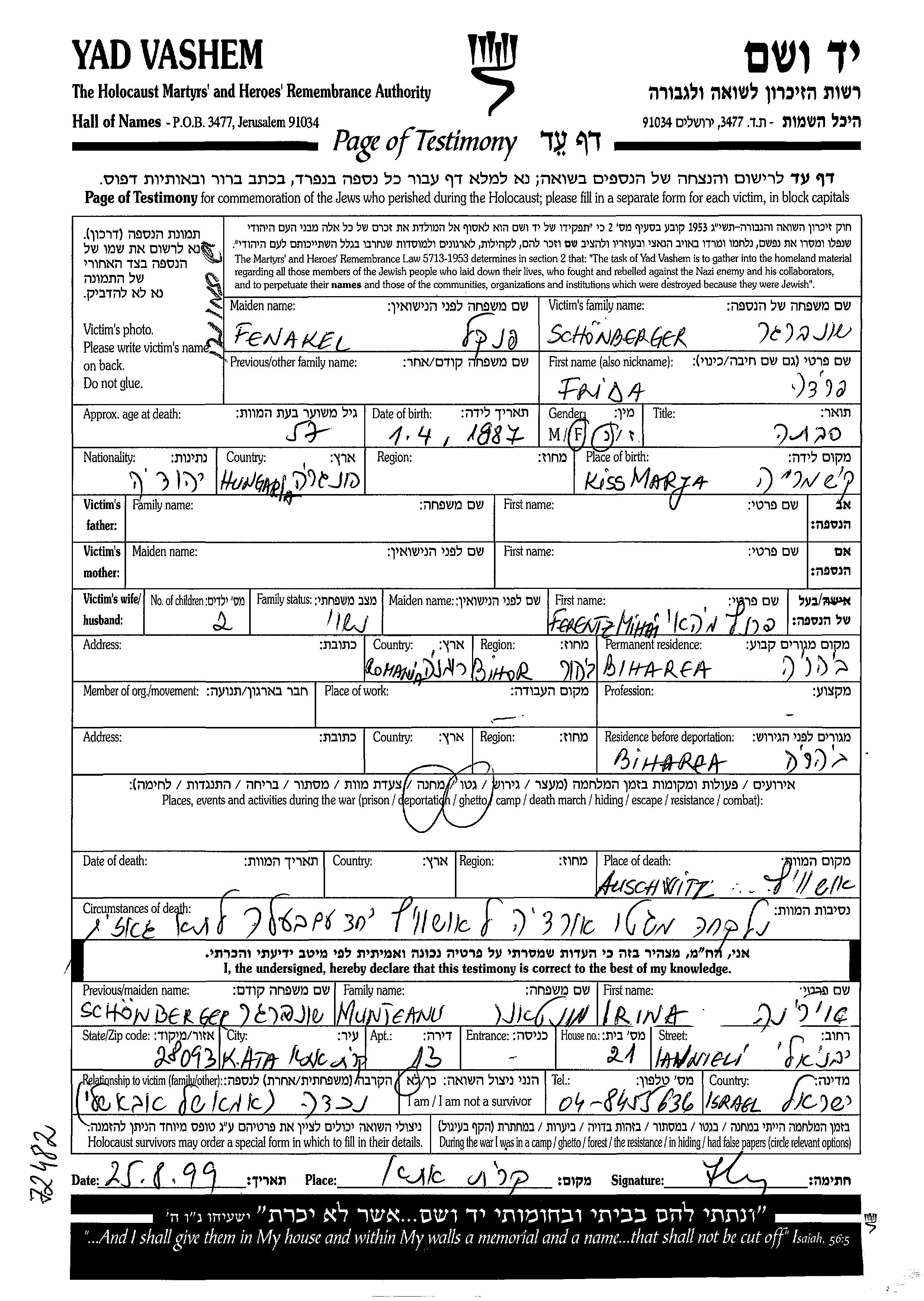 Frida Schönberger, geb. Fenakel wurde im Jahr 1887 in Kismarja, Ungarn geboren. Vor dem Zweiten Weltkrieg lebte sie in Biharea, Rumänien.