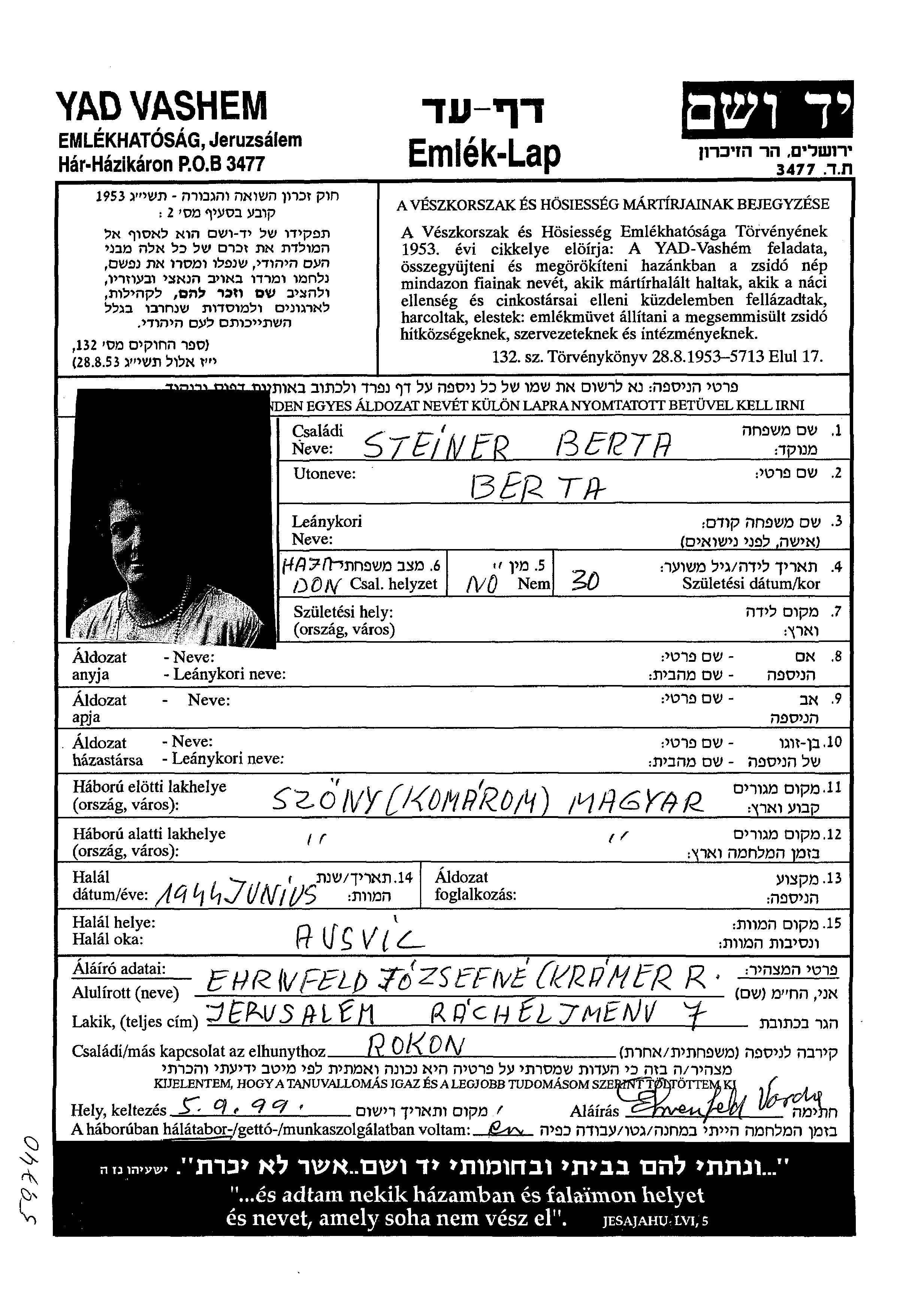 Berta Steiner. Vor dem Zweiten Weltkrieg lebte sie in Szony, Ungarn.