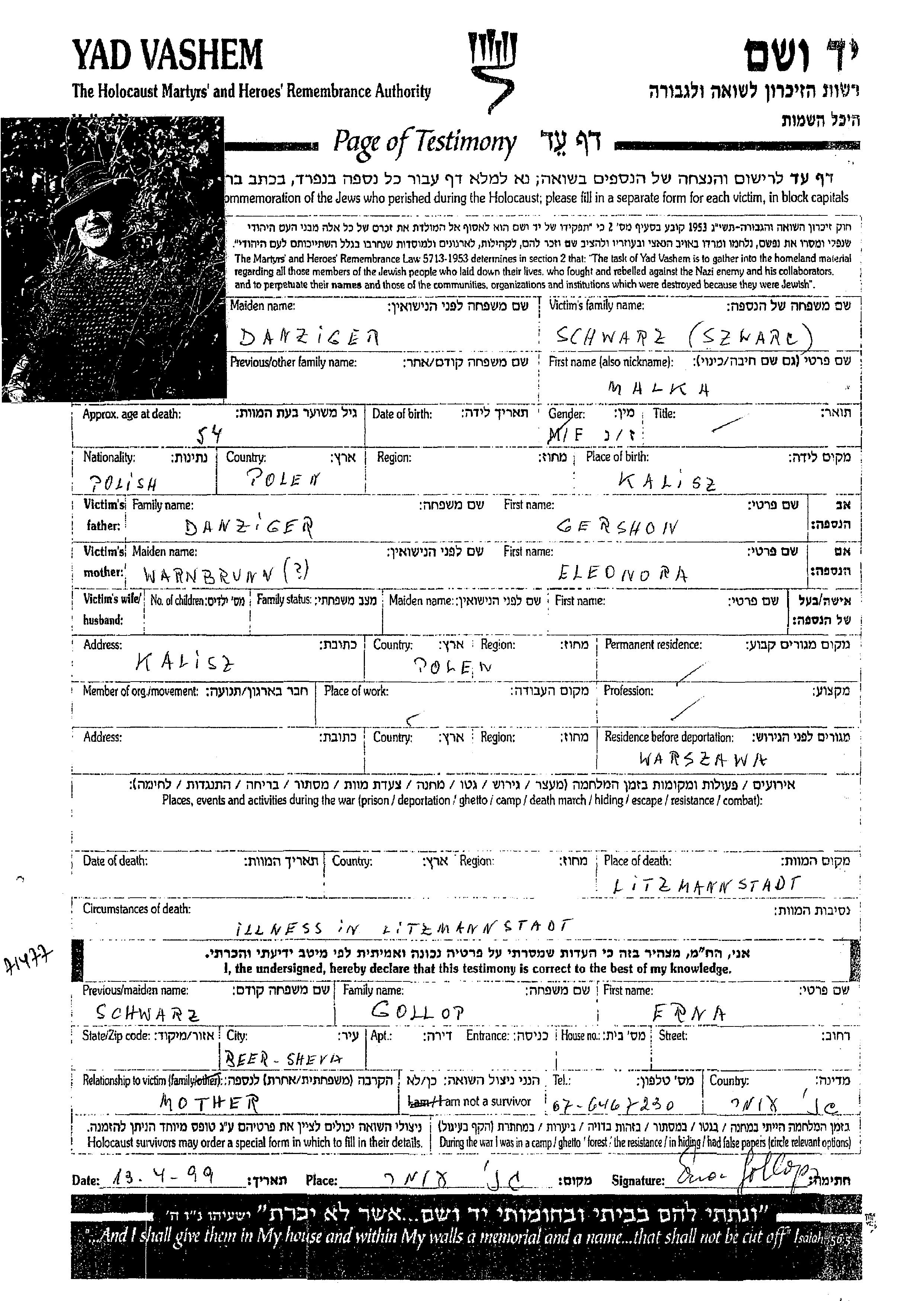 Malka Schwarz, geb. Danziger wurde in Kalisz, Polen geboren. Vor dem Zweiten Weltkrieg lebte sie in Kalisz, Polen.