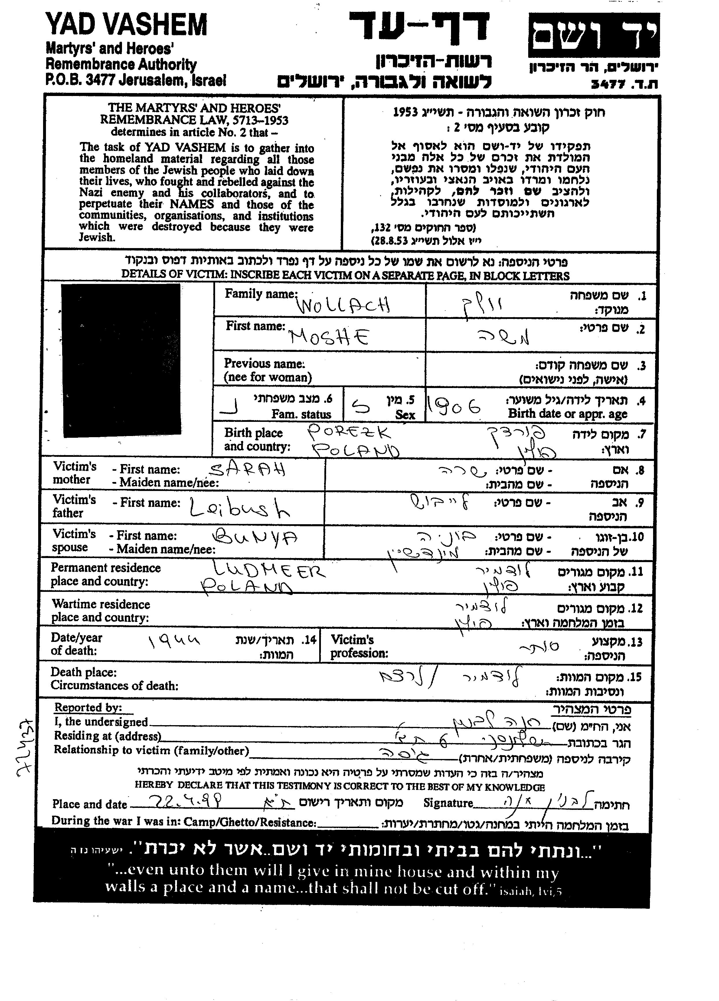 Moshe wurde in der Schoah ermordet. Todesort: Wlodzimierz, Polen im Jahr 1944.