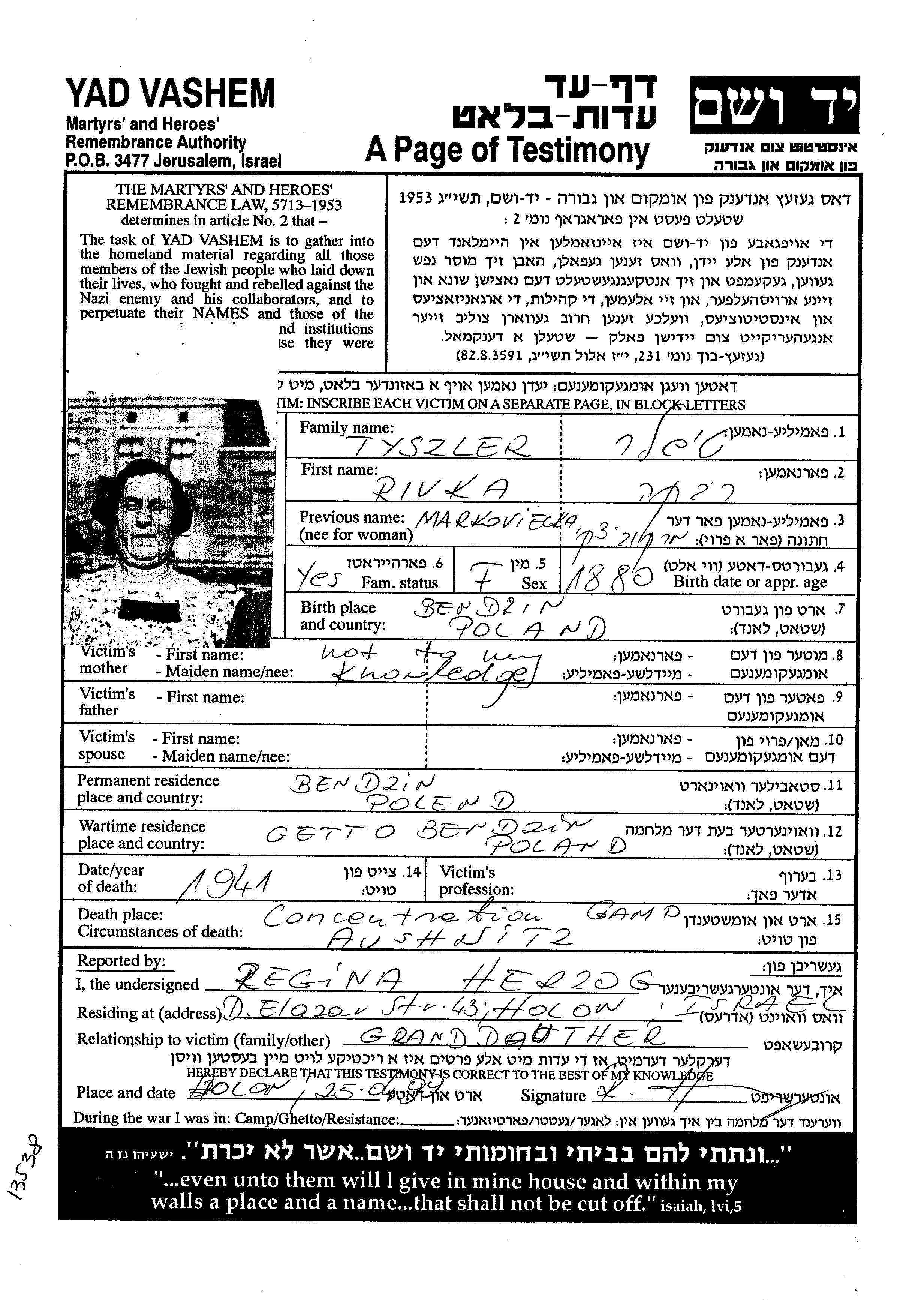 Rivka Tyszler, geb. Markoviecka wurde im Jahr 1880 in Będzin, Polen geboren. Vor dem Zweiten Weltkrieg lebte sie in Będzin, Polen.