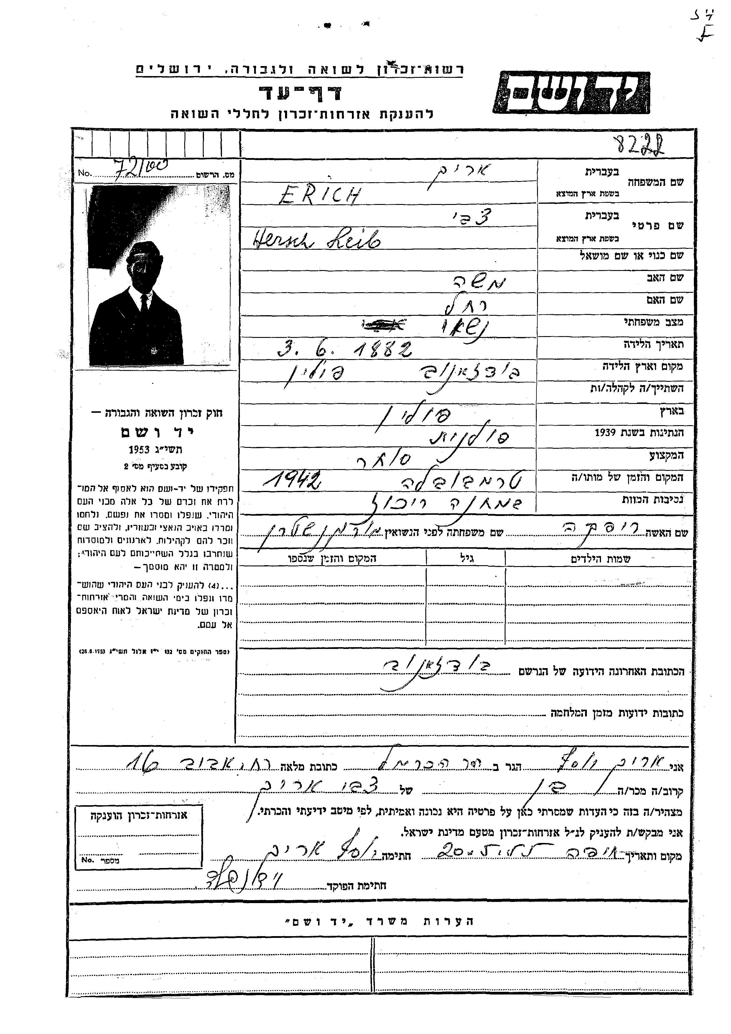 Hersch Leib Tzvi Erich wurde im Jahr 1882 in Budzanow, Polen geboren. Er war Kaufmann/-frau. Vor dem Zweiten Weltkrieg lebte er in Budzanow, Polen.
