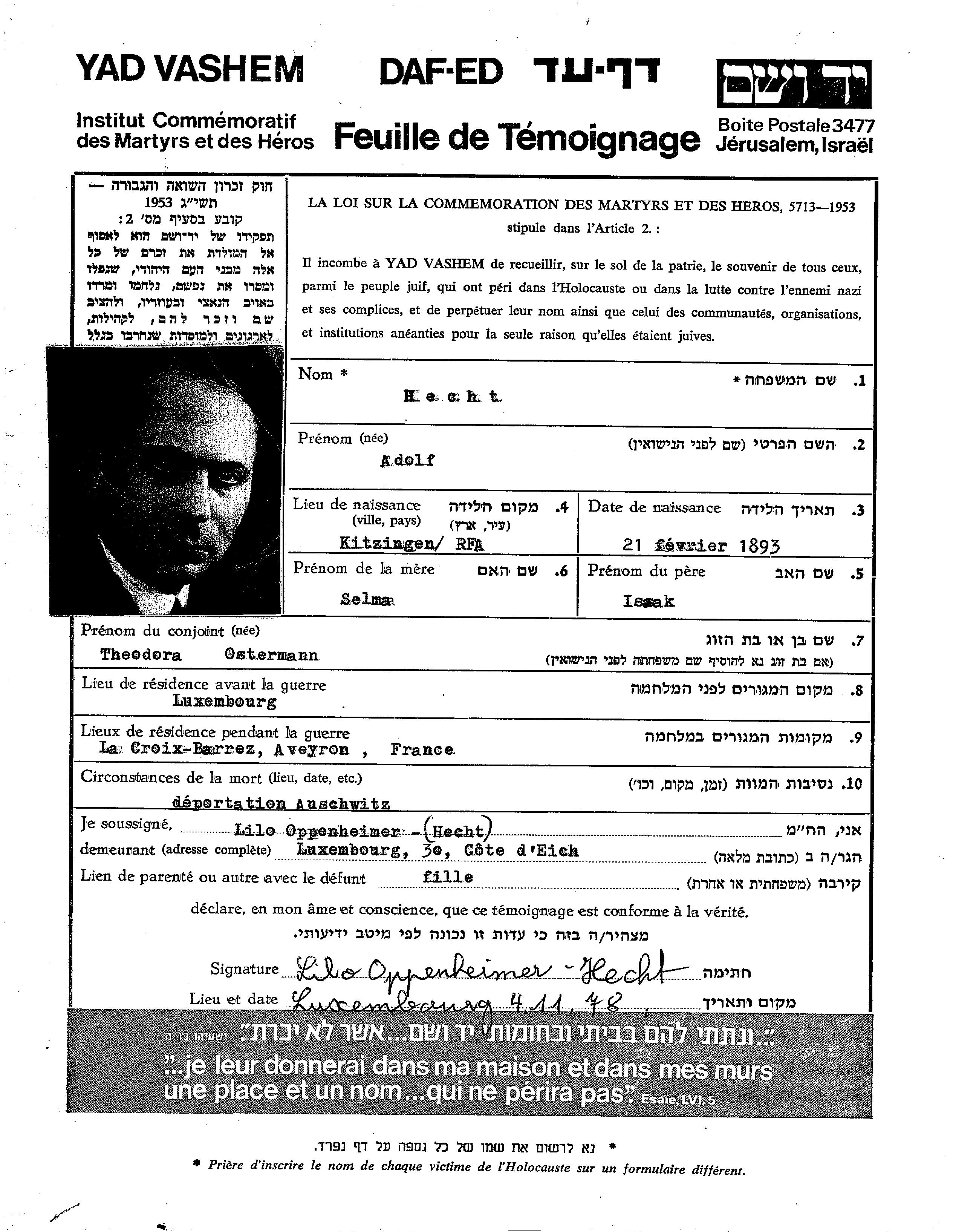 Adolf Hecht wurde im Jahr 1893 in Kitzingen, Deutsches Reich geboren. Vor dem Zweiten Weltkrieg lebte er in Luxemburg.