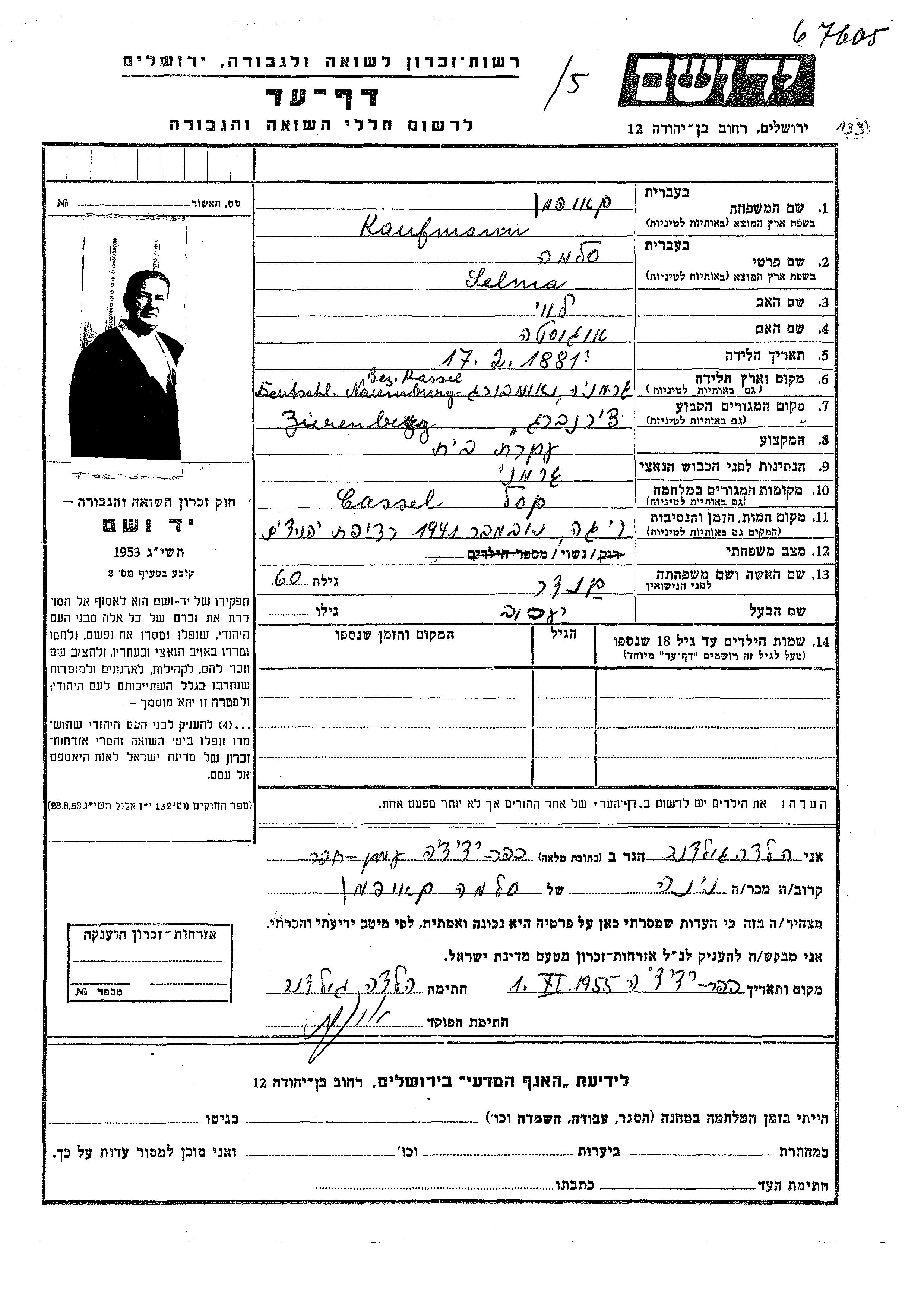 Kaufmann | Selma | 1881 | Zierenberg, Deutsches Reich | Gedenkblatt |
