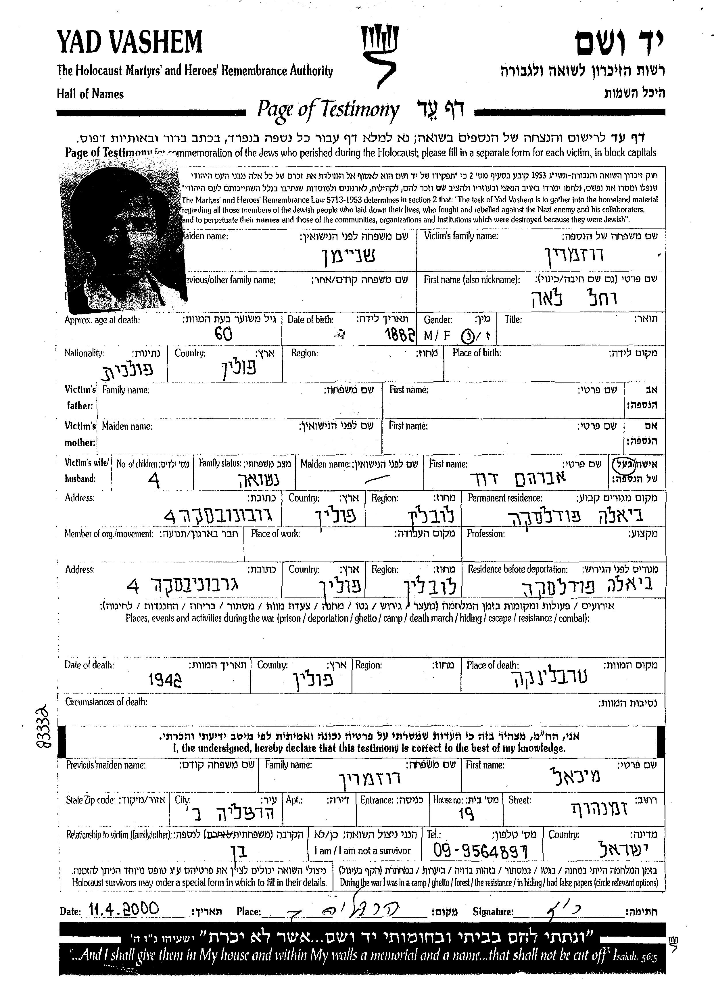Rozmarin Rakhel Lea 1882 Biala Podlaska, Polen Gedenkblatt