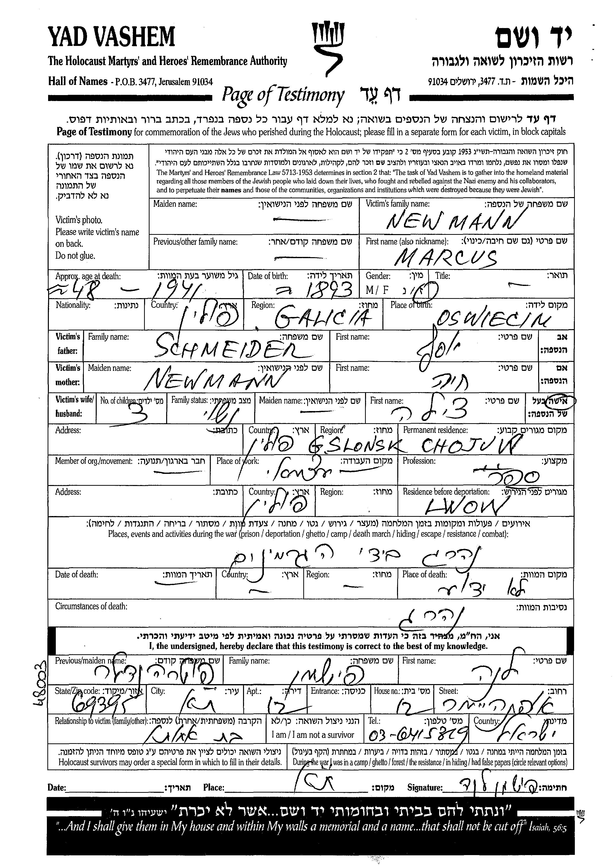 Marcus Newmann Schneider wurde im Jahr 1893 in Oświęcim, Polen geboren. Er war Friseur/-in. Vor dem Zweiten Weltkrieg lebte er in Chorzow, Polen.
