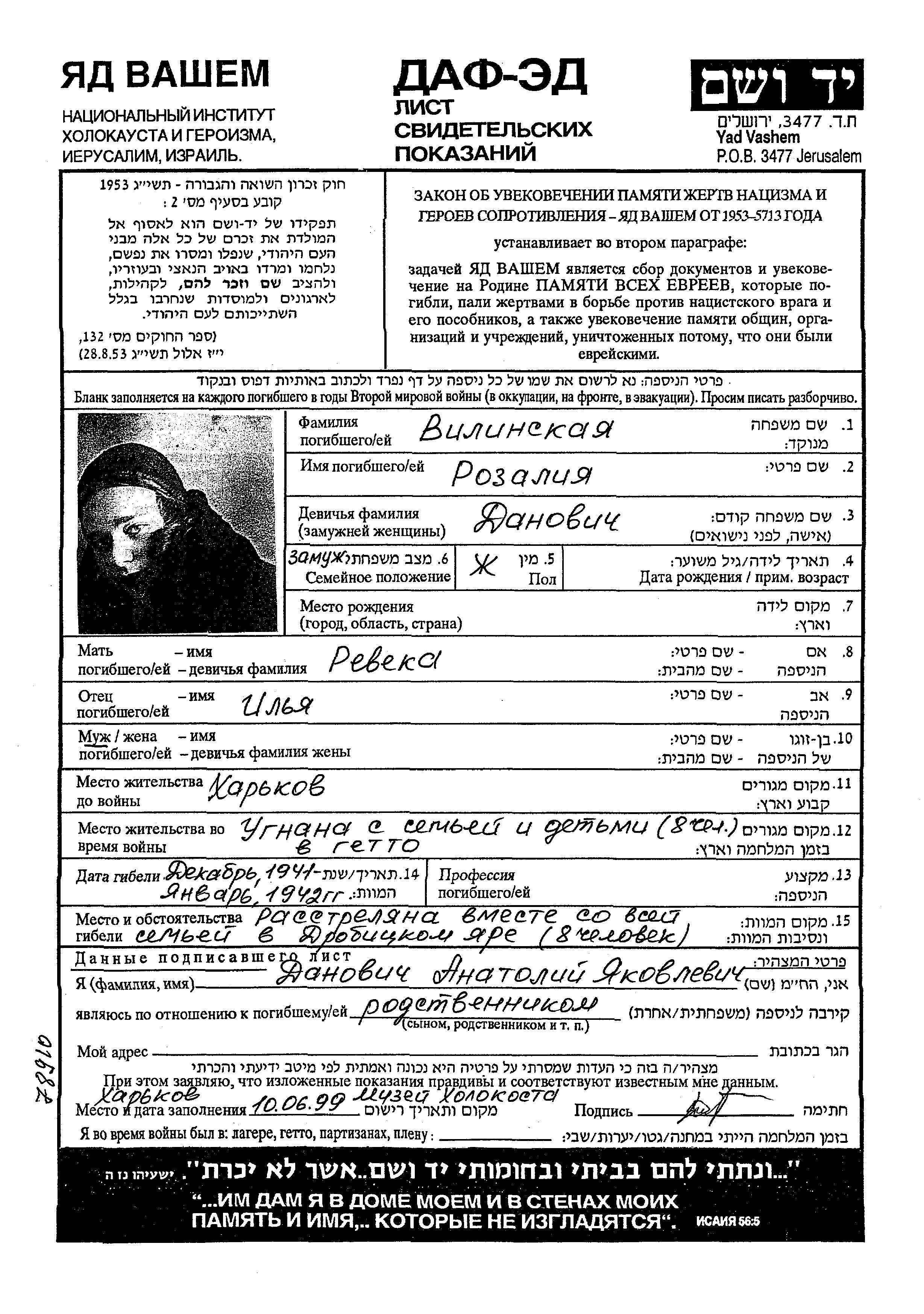 Rozalia wurde in der Schoah ermordet. Todesort: Drobitskiy Yar, Massaker Ort im Jahr 1941.