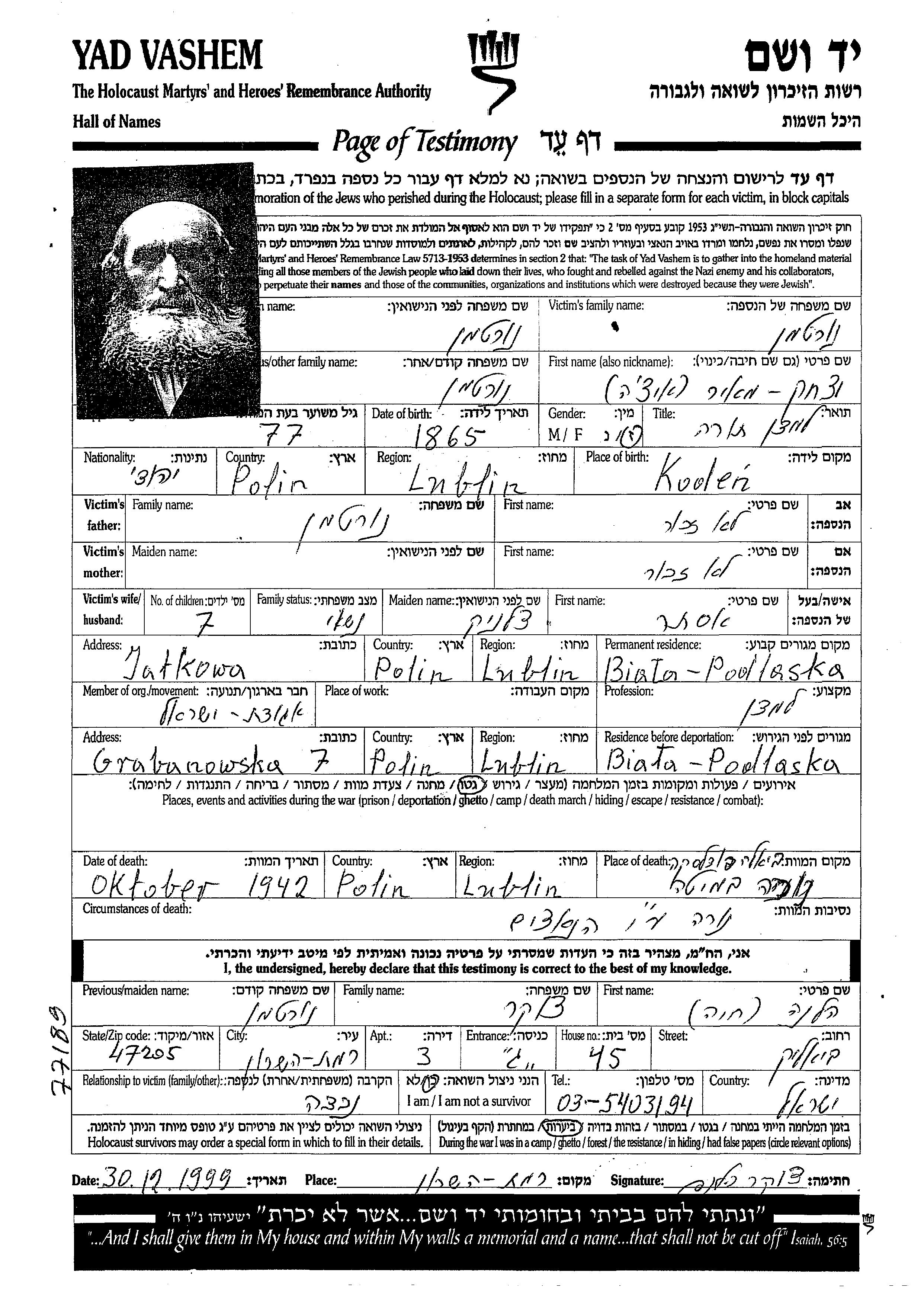 Yitzkhak Meir wurde in der Schoah ermordet. Todesort: Biala Podlaska, Polen im Jahr 1942.