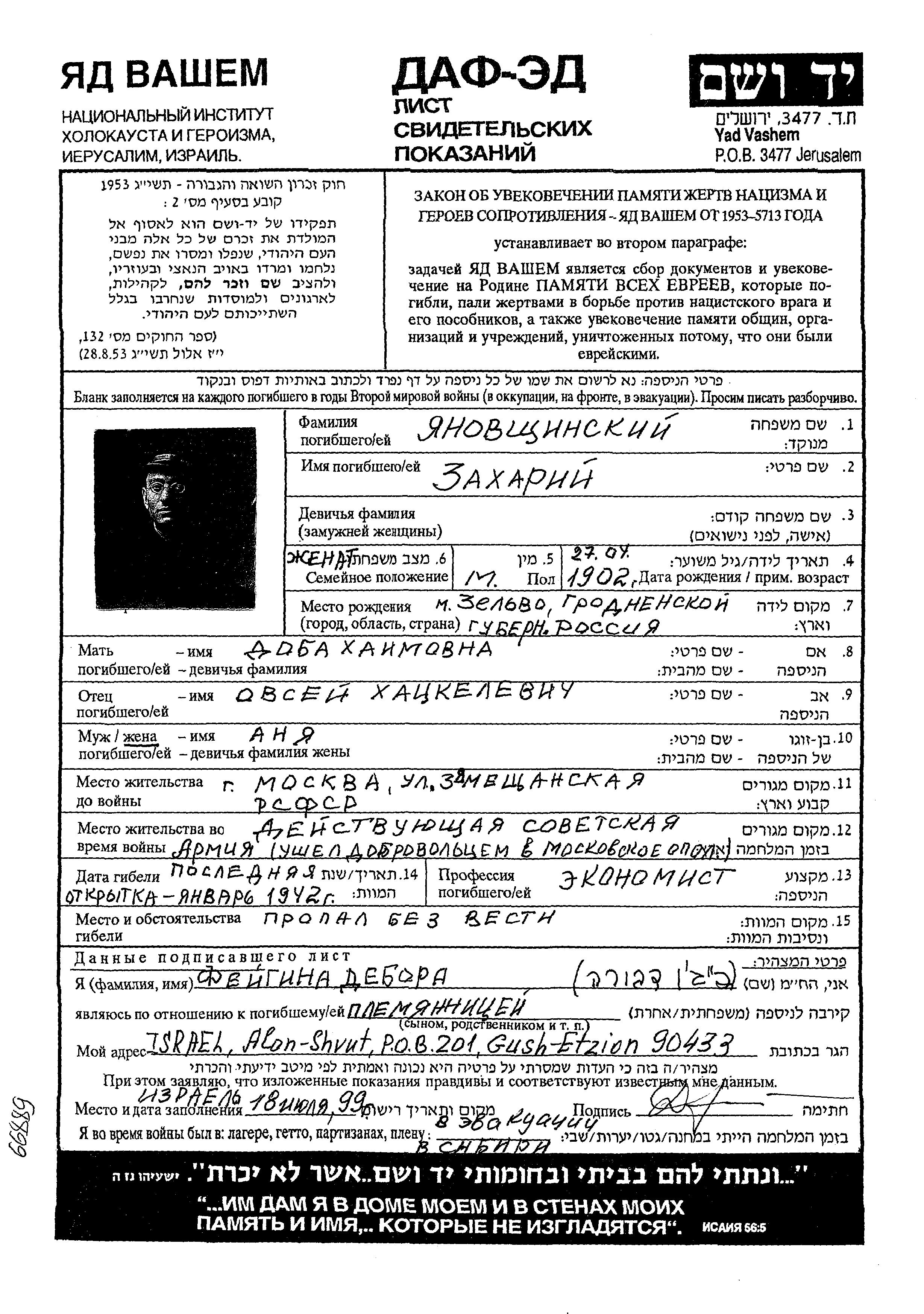Zakharia Yanovshchinski wurde im Jahr 1902 in Zelwa, Polen geboren. Er war Ökonom/-in. Vor dem Zweiten Weltkrieg lebte er in Moskva, Russland (UdSSR).
