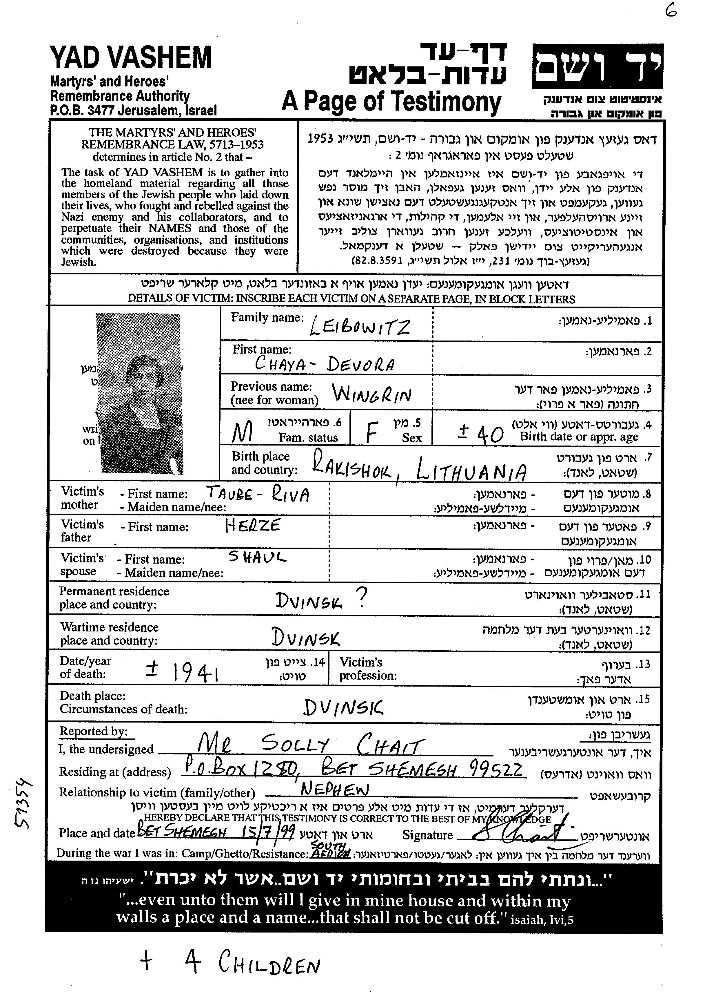 Chaya Devora Leibowitz, geb. Wingrin wurde in Rokiskis, Litauen geboren. Vor dem Zweiten Weltkrieg lebte sie in Daugavpils, Lettland.