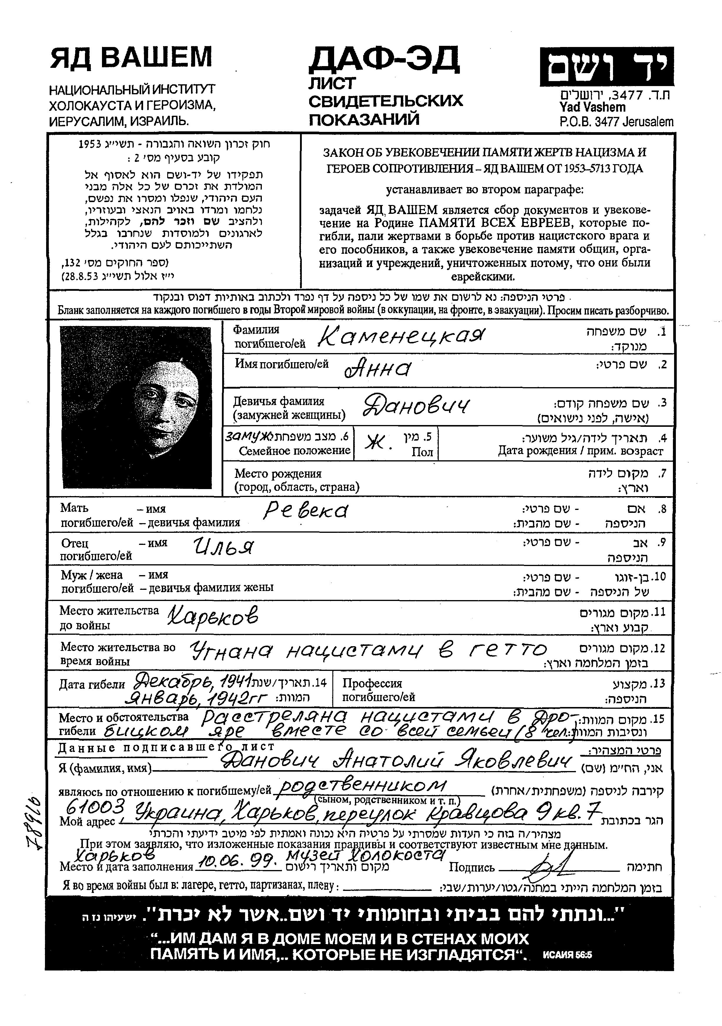 Anna wurde in der Schoah ermordet. Todesort: Drobitskiy Yar, Massaker Ort im Jahr 1941.