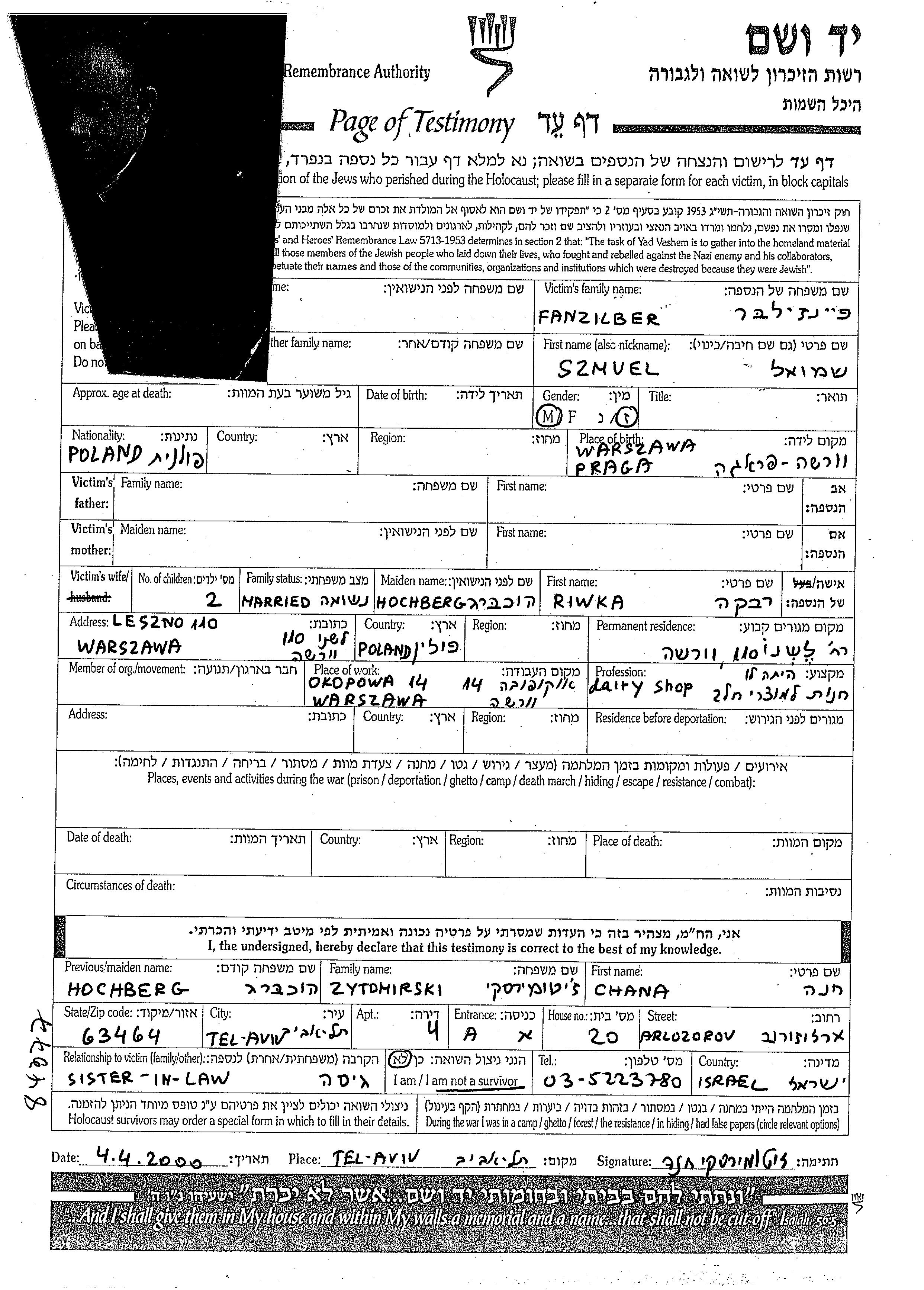 Szmuel Fanzilber wurde in Warszawa, Polen geboren. Vor dem Zweiten Weltkrieg lebte er in Warszawa, Polen.