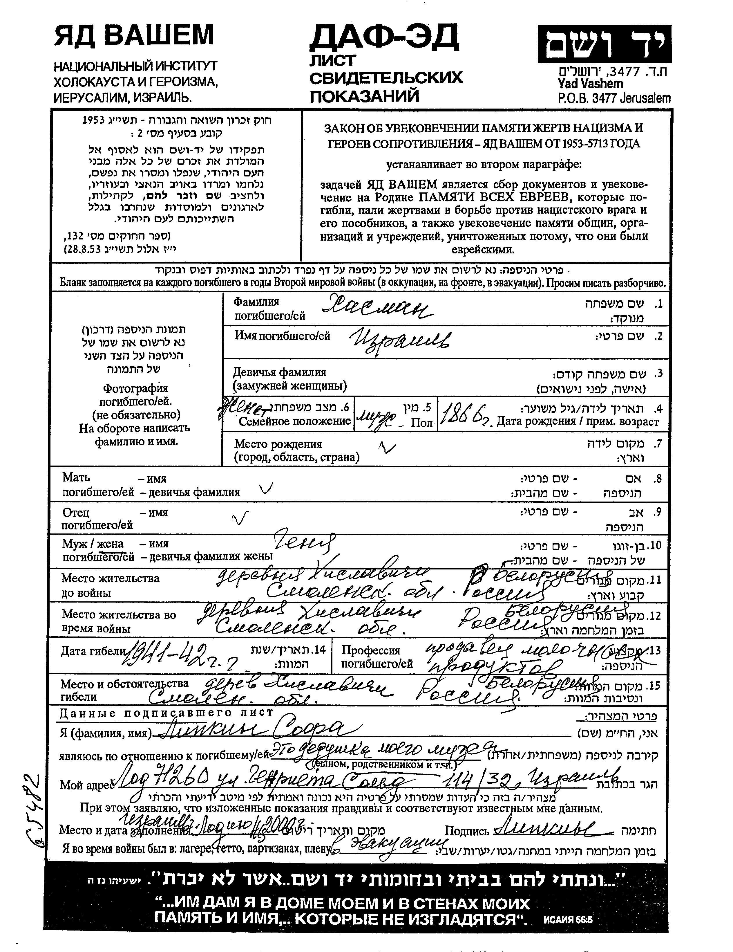 Izrail Khasman wurde im Jahr 1866 geboren. Er war Verkäufer/-in. Vor dem Zweiten Weltkrieg lebte er in Khislavichi, Russland (UdSSR).
