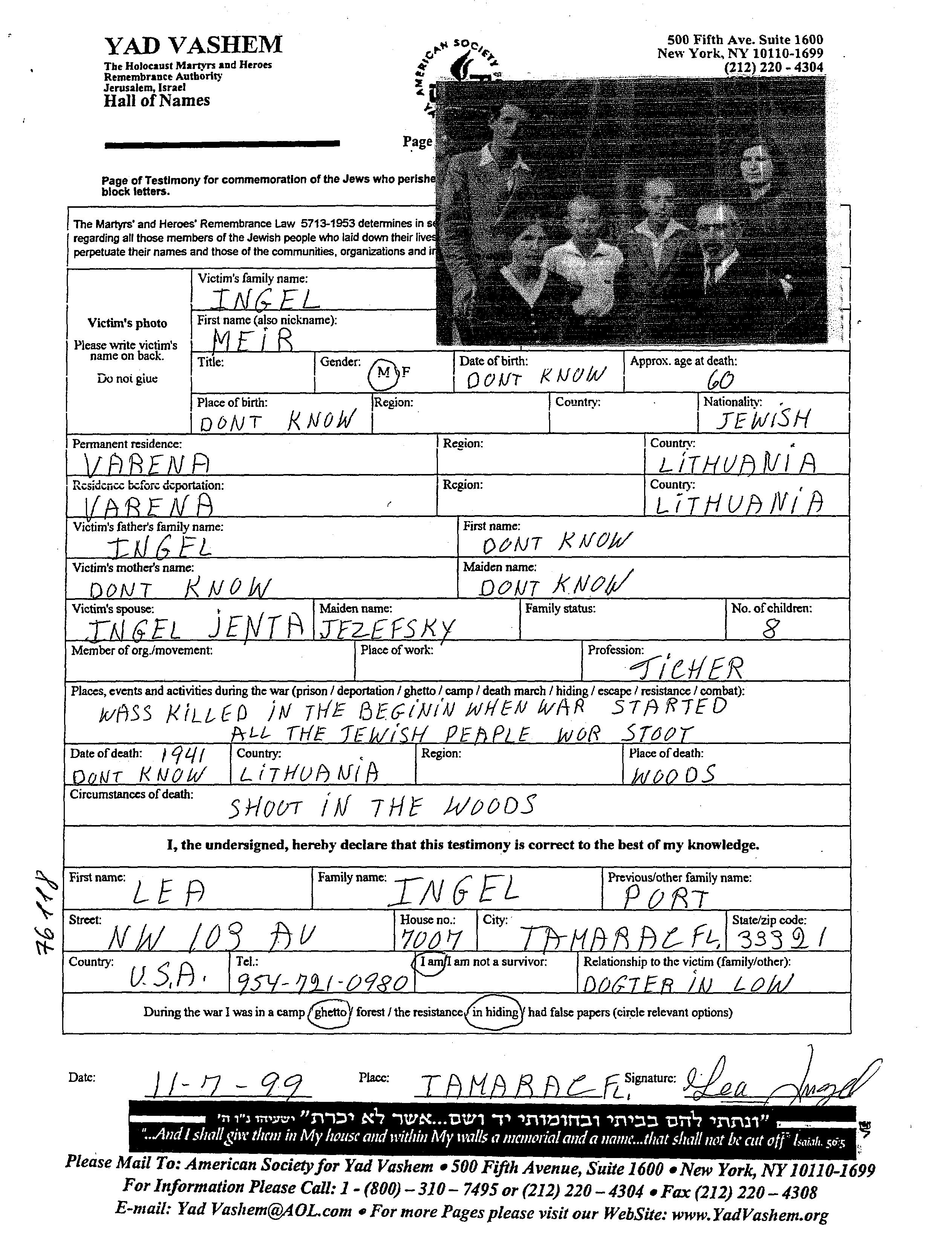 Meir Ingel. Er war Lehrer/in. Vor dem Zweiten Weltkrieg lebte er in Orany, Polen.
