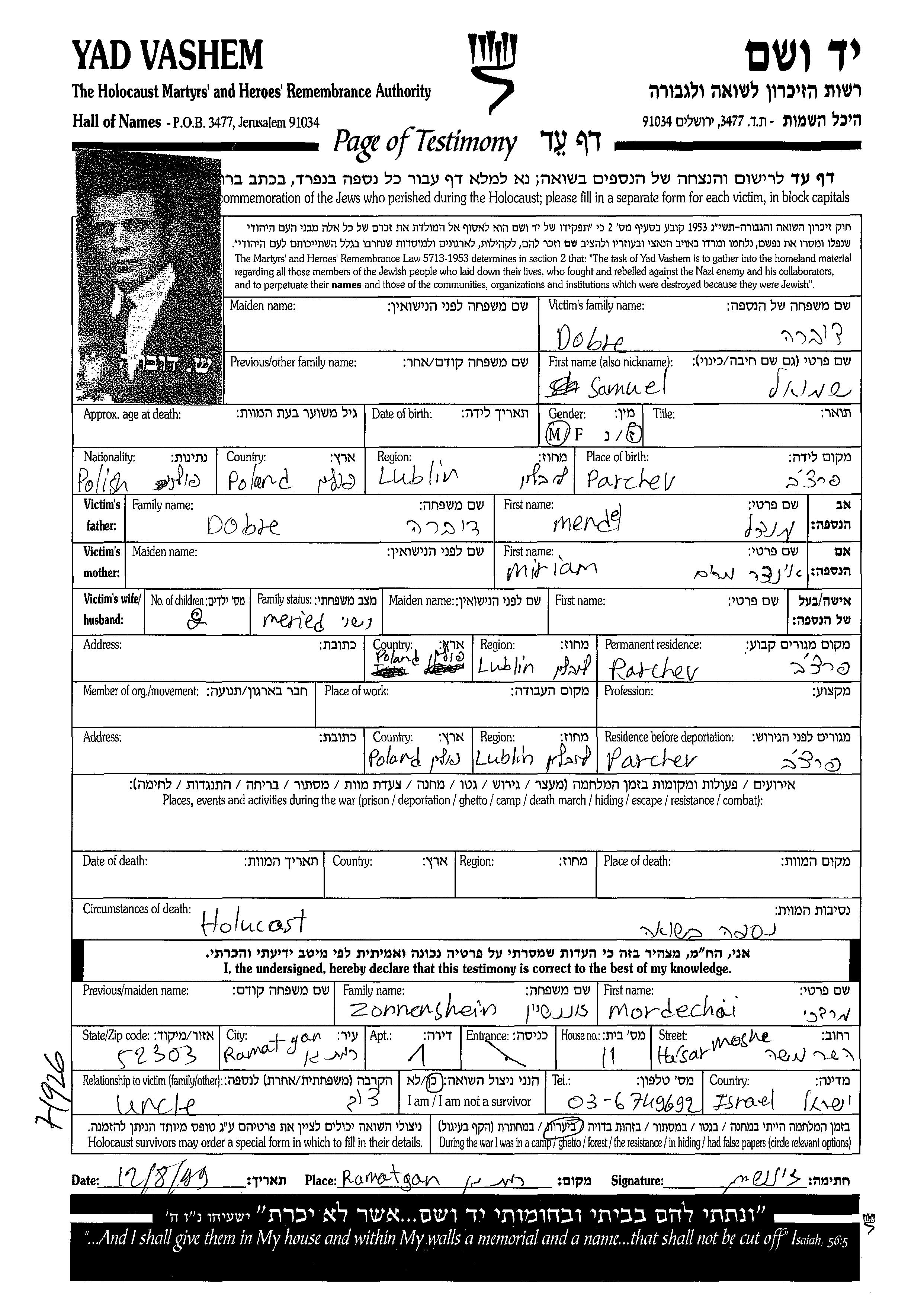 Shmuel Dobre wurde in Parczew, Polen geboren. Vor dem Zweiten Weltkrieg lebte er in Parczew, Polen.
