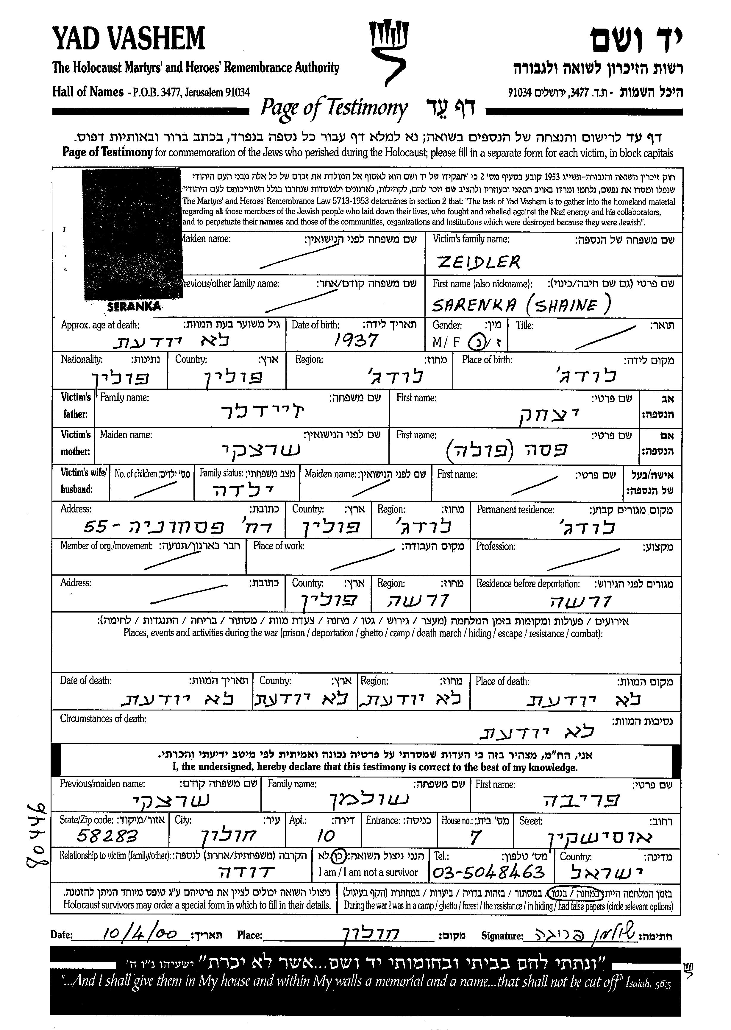 Sarenka Shaine Zeidler wurde im Jahr 1937 in Łódź, Polen geboren. Vor dem Zweiten Weltkrieg lebte sie in Łódź, Polen.