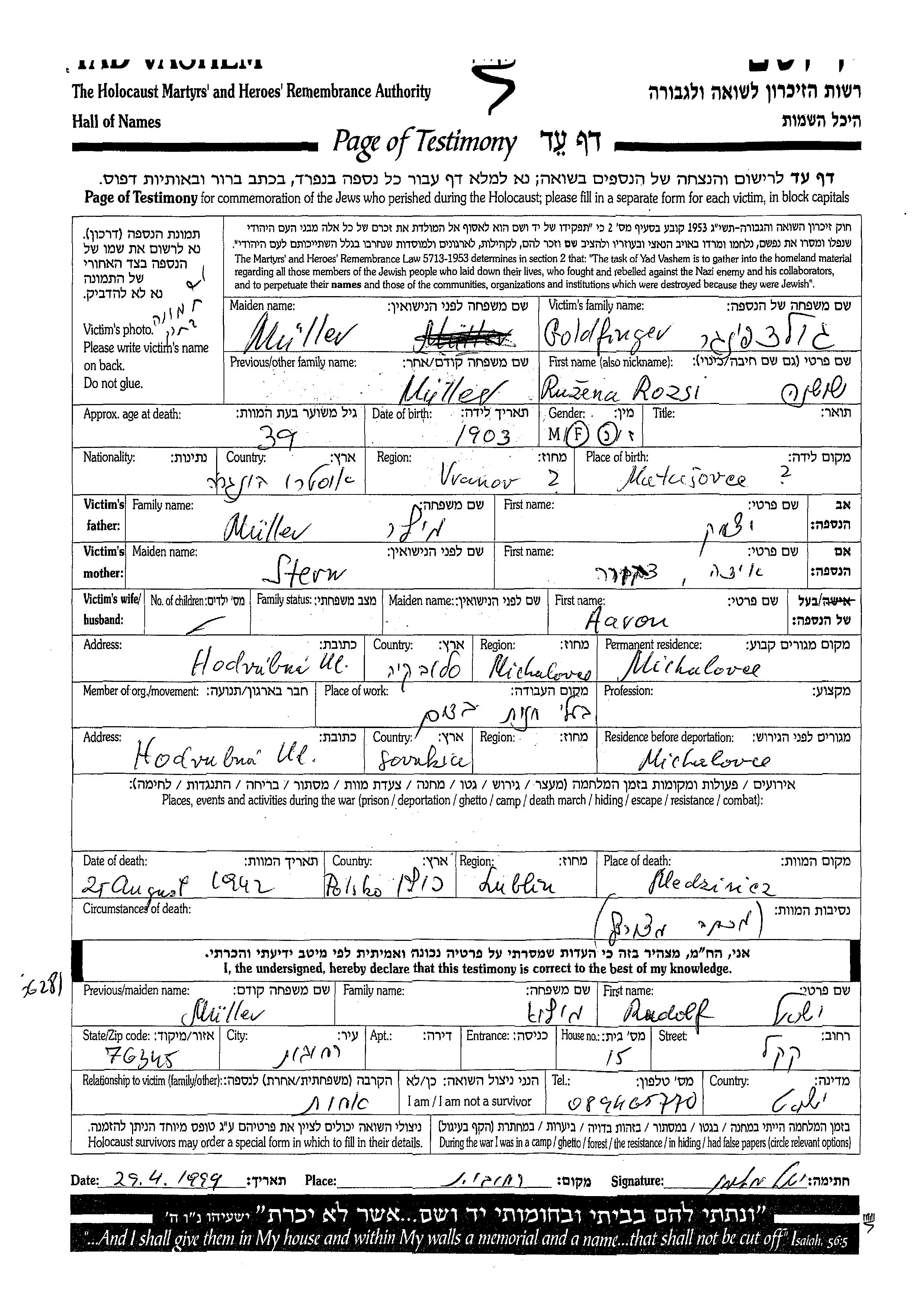 Ruzena Shoshana Goldfinger, geb. Müller wurde im Jahr 1903 in Matiasovce, Tschechoslowakei geboren. Vor dem Zweiten Weltkrieg lebte sie in Michalovce, Tschechoslowakei.