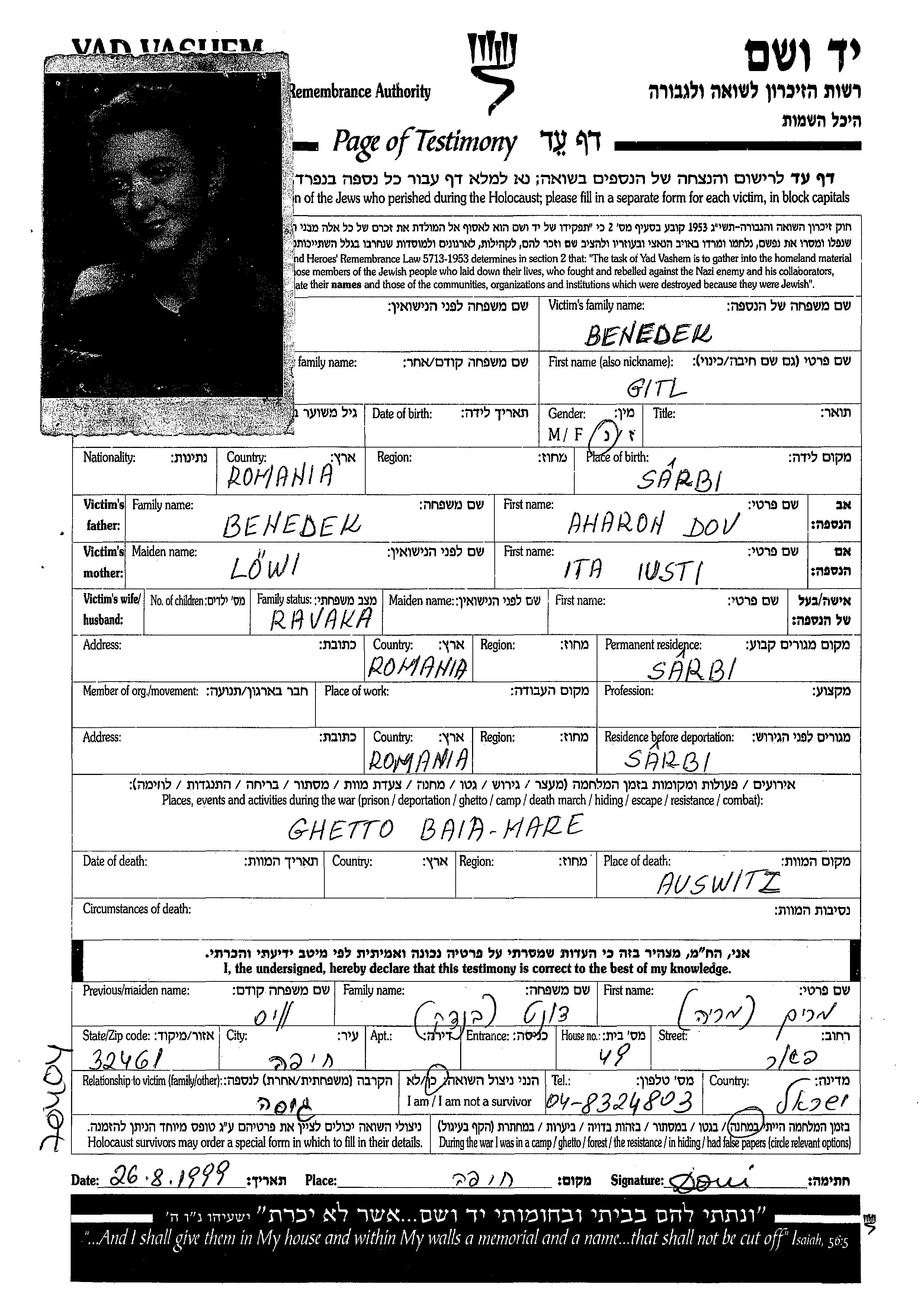 Gitl Benedek wurde in Sarbi, Rumänien geboren. Vor dem Zweiten Weltkrieg lebte sie in Sarbi, Rumänien.