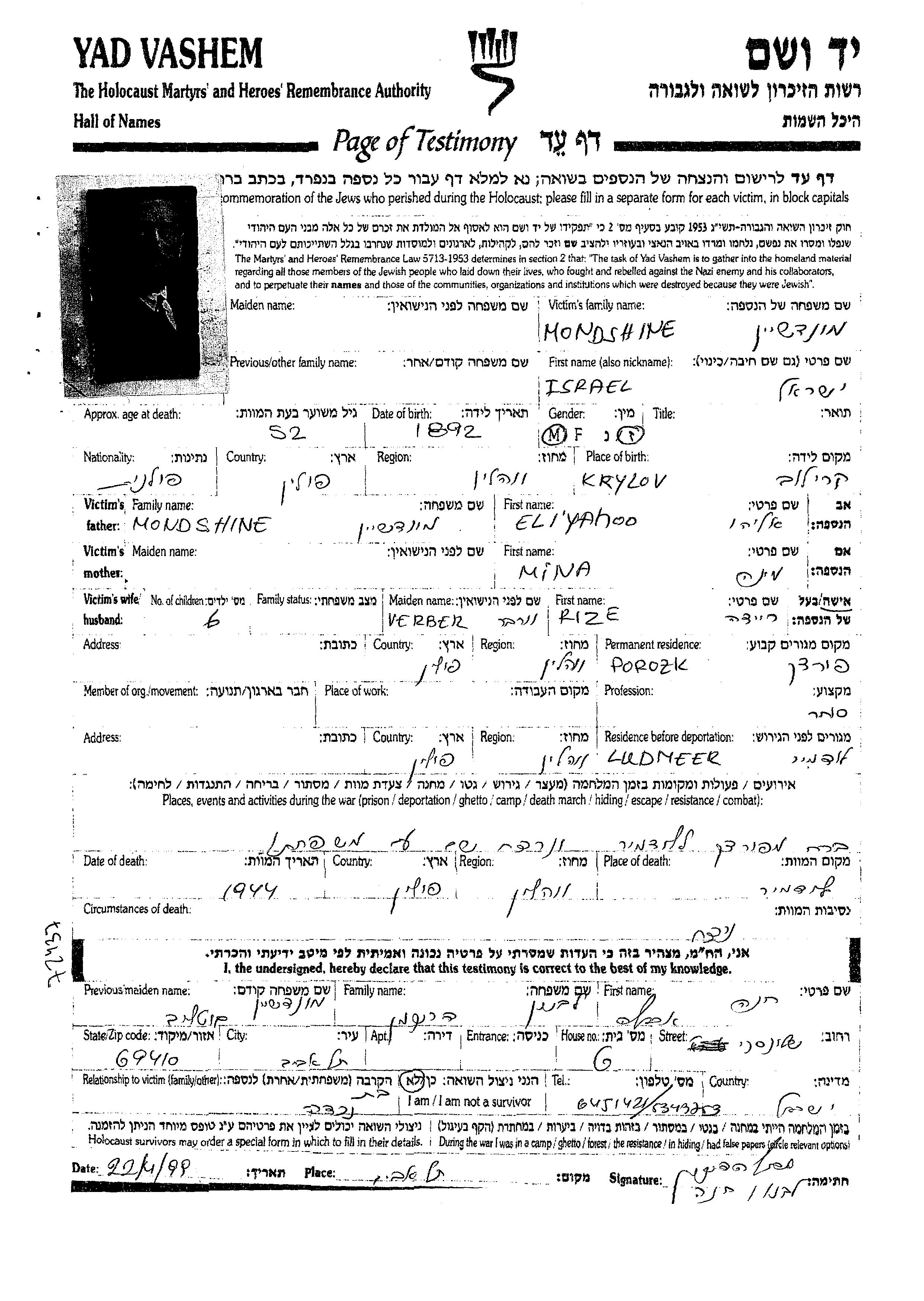 Israel Mondshine wurde im Jahr 1892 in Krylow, Polen geboren. Vor dem Zweiten Weltkrieg lebte er in Poryck, Polen.