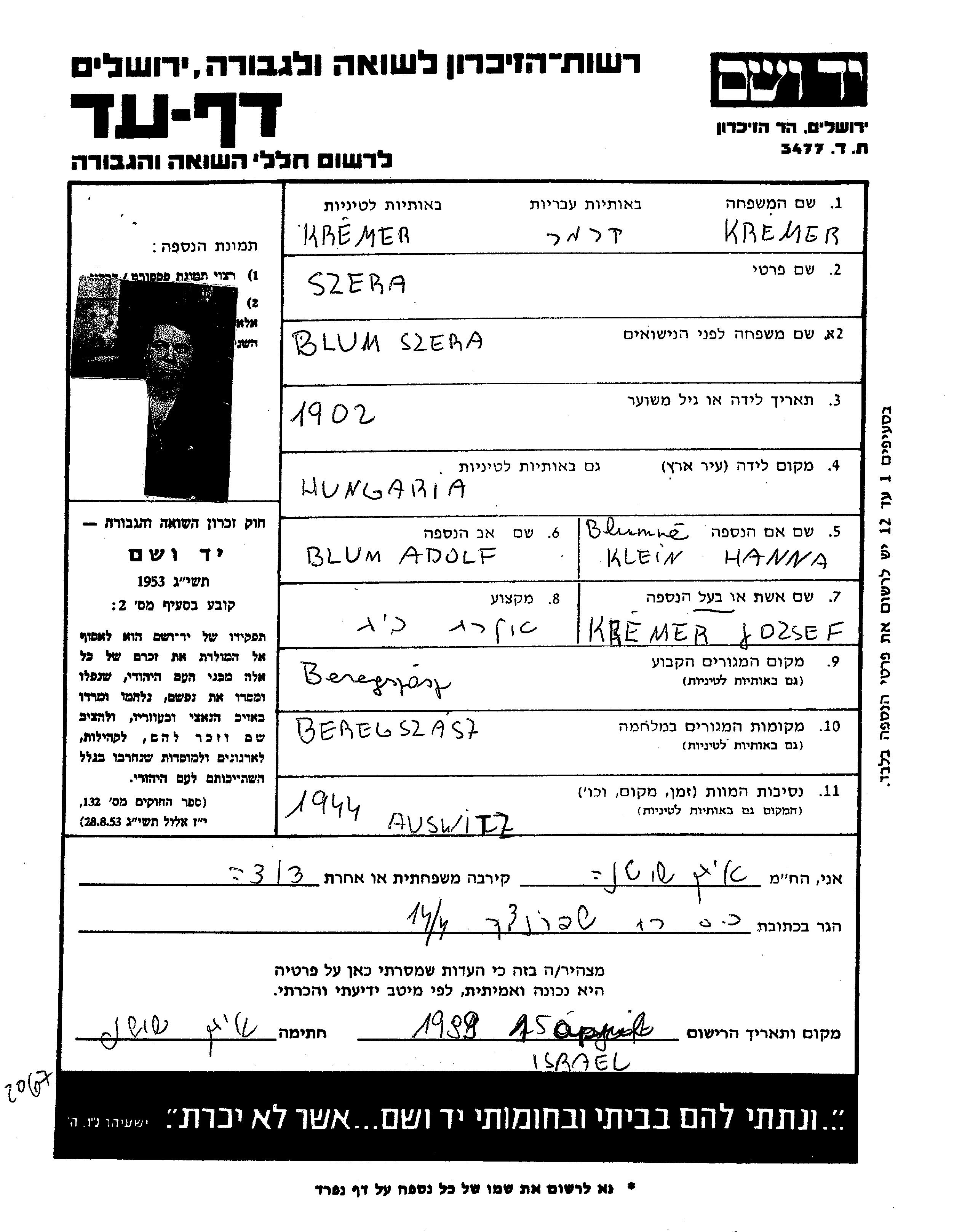 Kremer | Szera | 1902 | Beregszasz, Tschechoslowakei | Gedenkblatt |