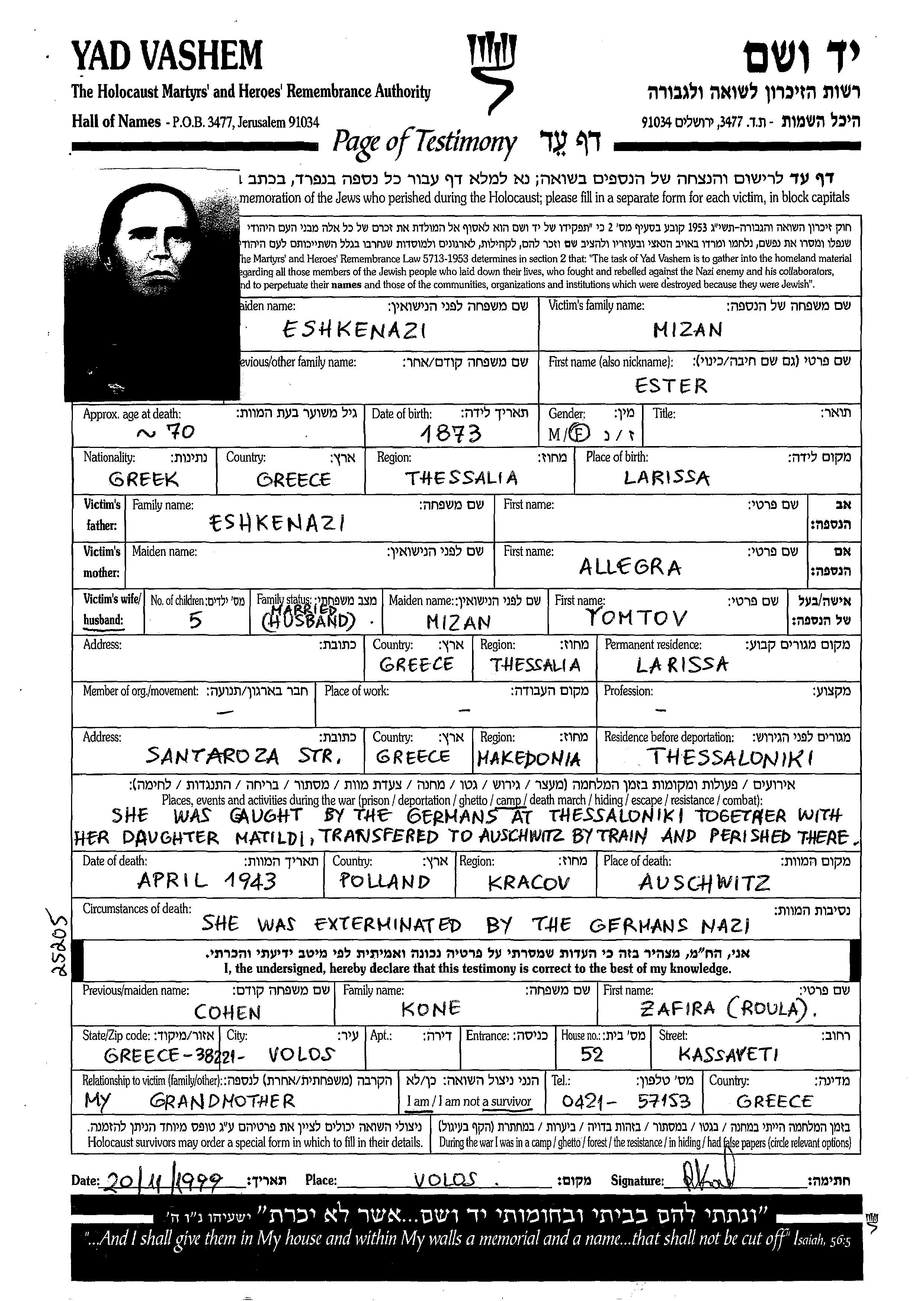 Ester Mizan, geb. Ashkenazi wurde im Jahr 1873 in Larissa, Griechenland geboren. Vor dem Zweiten Weltkrieg lebte sie in Larissa, Griechenland.
