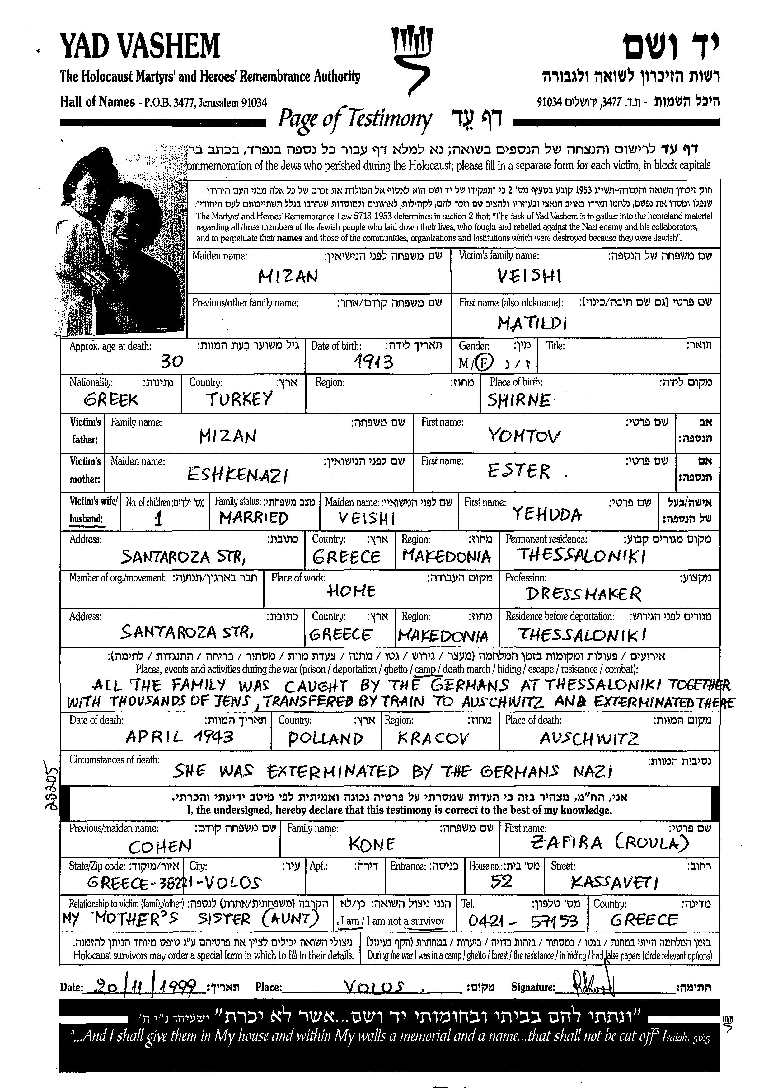 Matildi Veishi, geb. Mizan wurde im Jahr 1913 in Izmir, Türkei geboren. Sie war Schneiderin. Vor dem Zweiten Weltkrieg lebte sie in Thessaloniki, Griechenland.