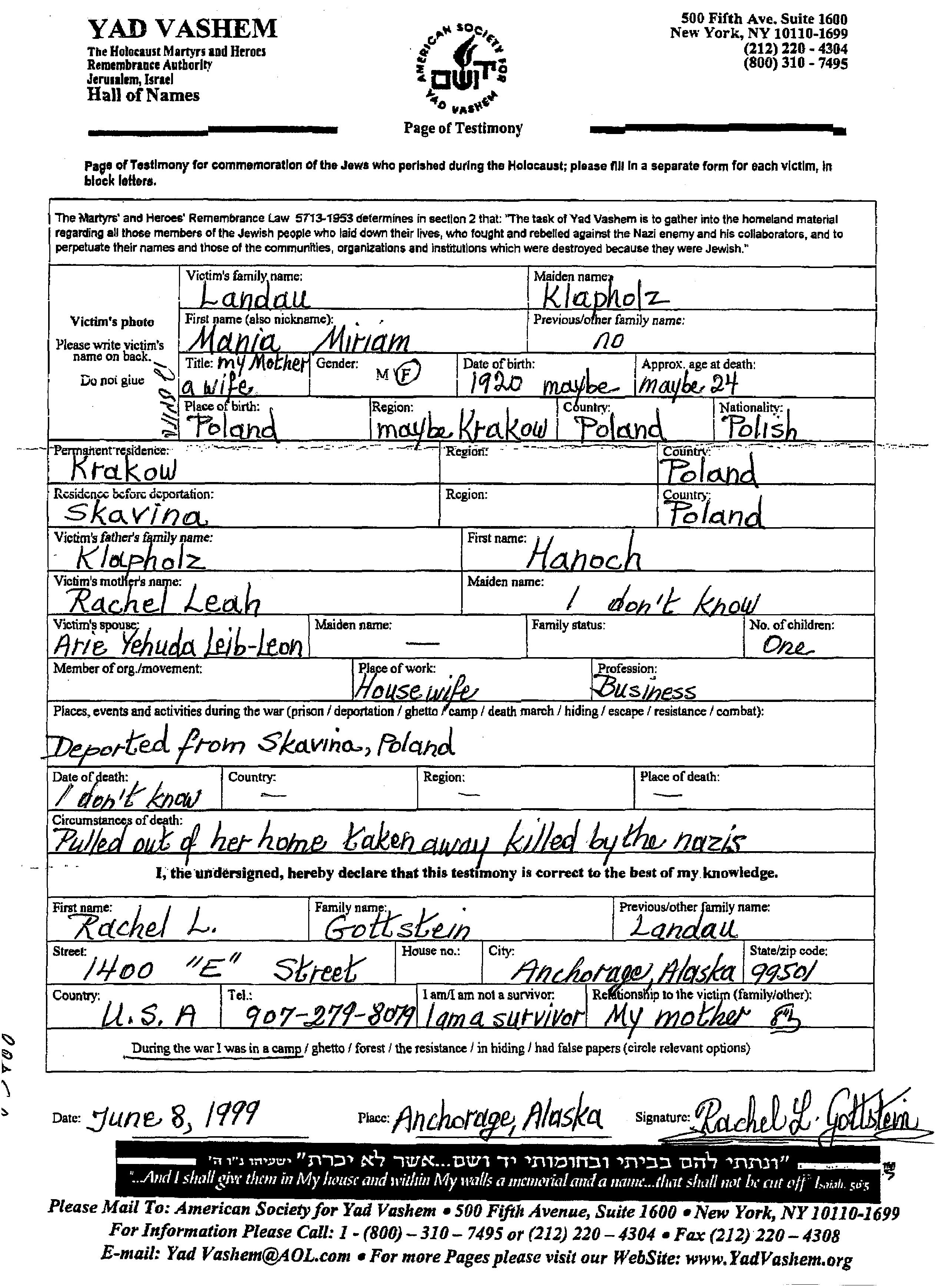 Miriam Mania Landau, geb. Klapholz wurde im Jahr 1920 in Krakow, Polen geboren. Vor dem Zweiten Weltkrieg lebte sie in Krakow, Polen.