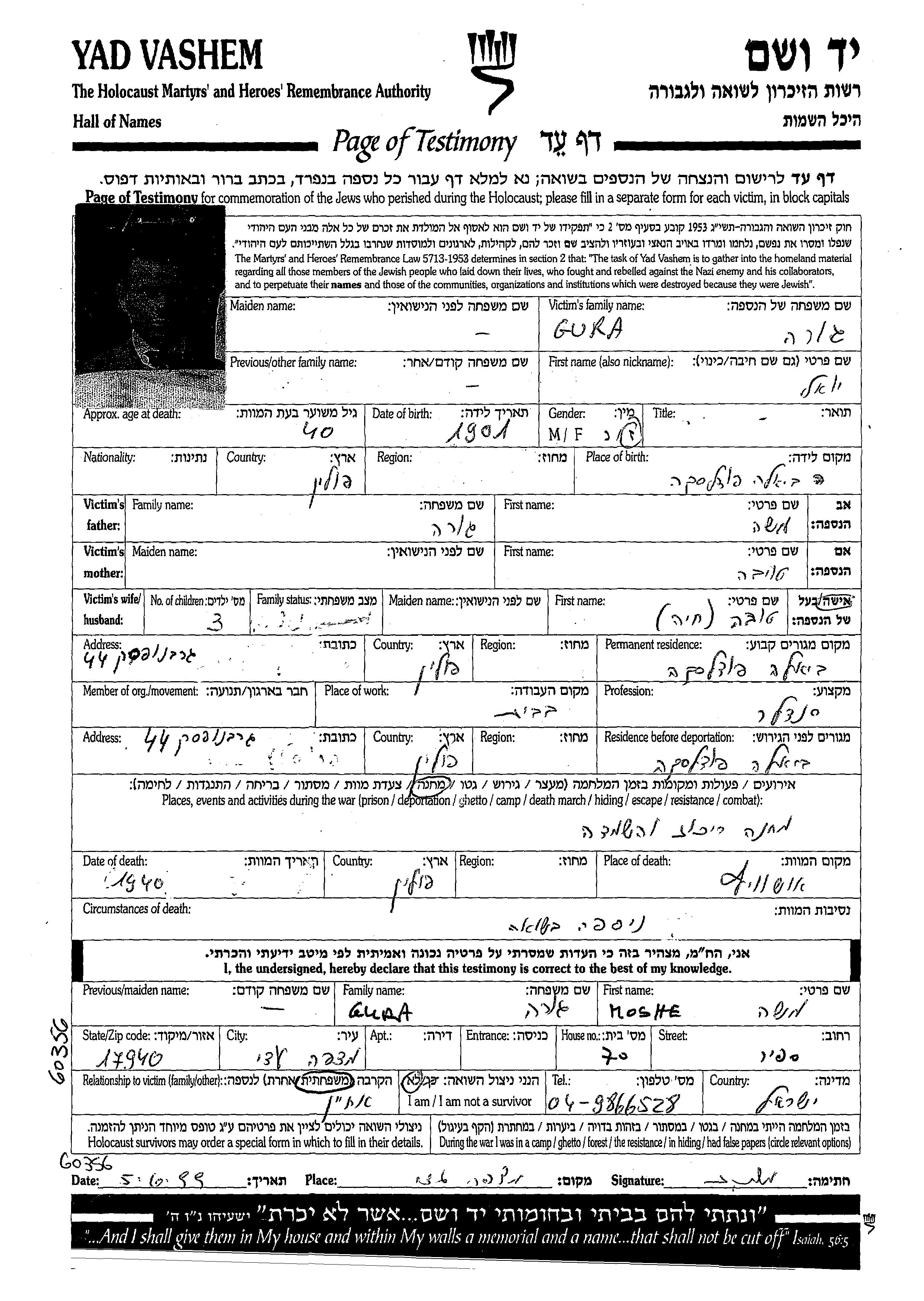 Yoel Gora wurde im Jahr 1901 in Biala Podlaska, Polen geboren. Er war Schuster/-in. Vor dem Zweiten Weltkrieg lebte er in Biala Podlaska, Polen.