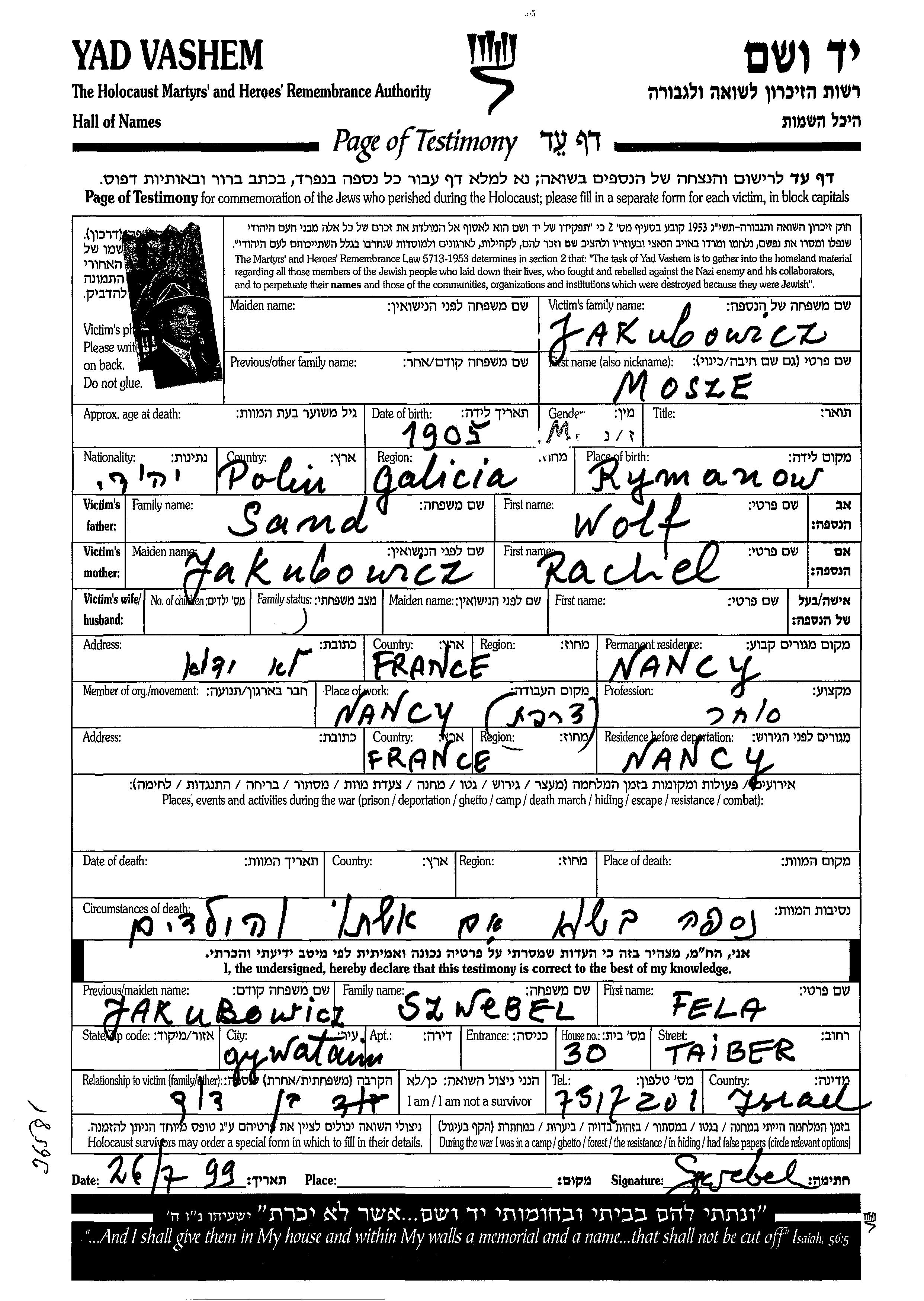 Mosze Jakubowicz Sand wurde im Jahr 1905 in Rymanow, Polen geboren. Er war Kaufmann/-frau. Vor dem Zweiten Weltkrieg lebte er in Nancy, Frankreich.