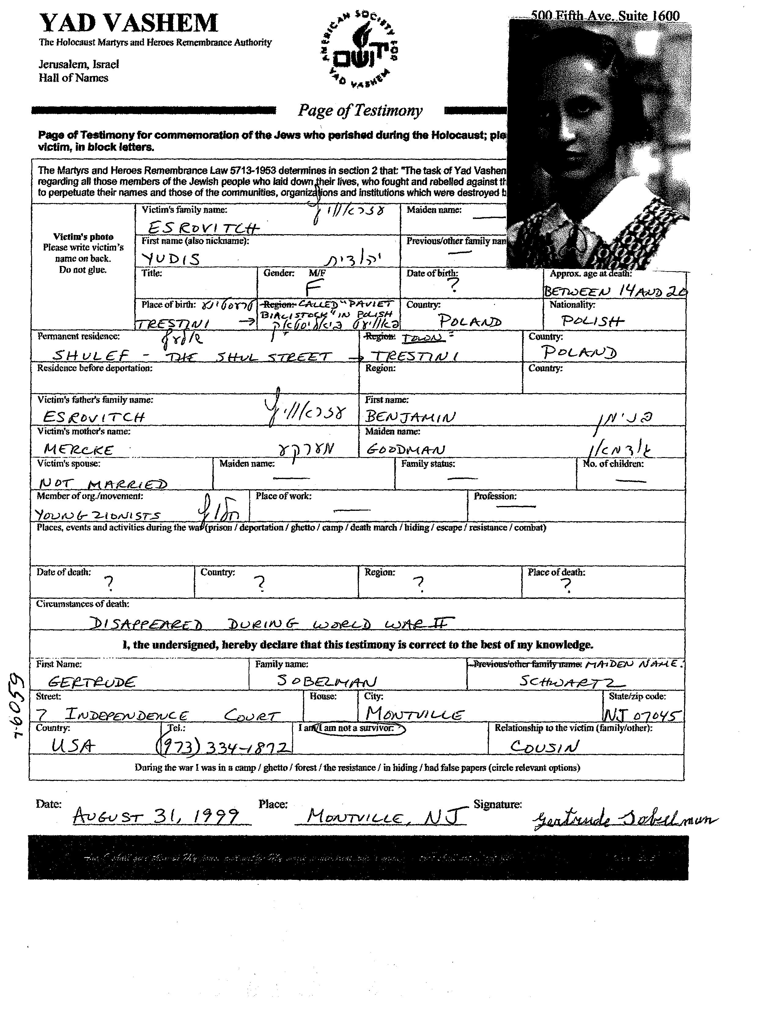 Yudis Esrovitch wurde in Trzcianne, Polen geboren. Vor dem Zweiten Weltkrieg lebte sie in Trzcianne, Polen.