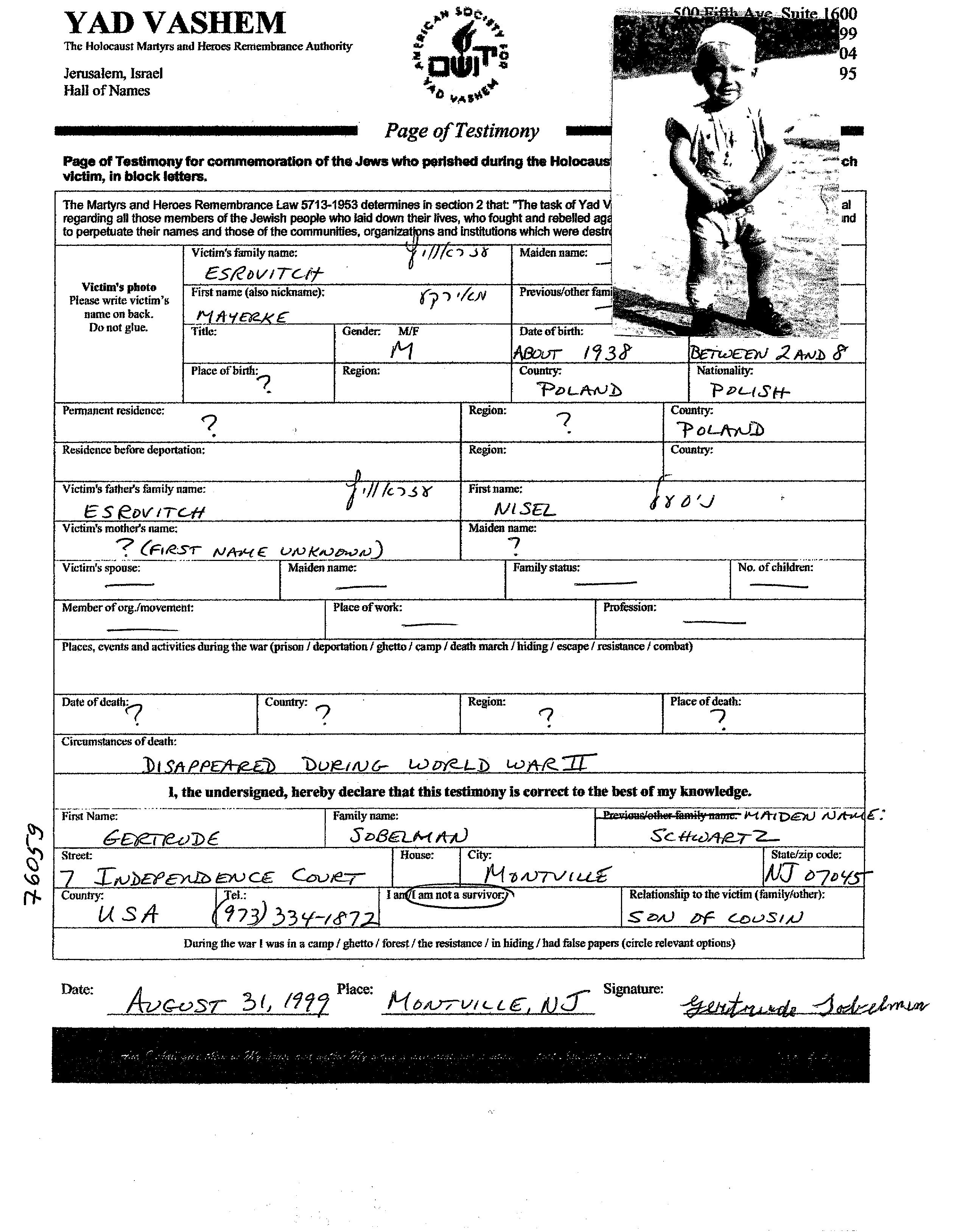 Mayerke Esrovitch wurde im Jahr 1938 in Polen geboren. Vor dem Zweiten Weltkrieg lebte er in Polen.