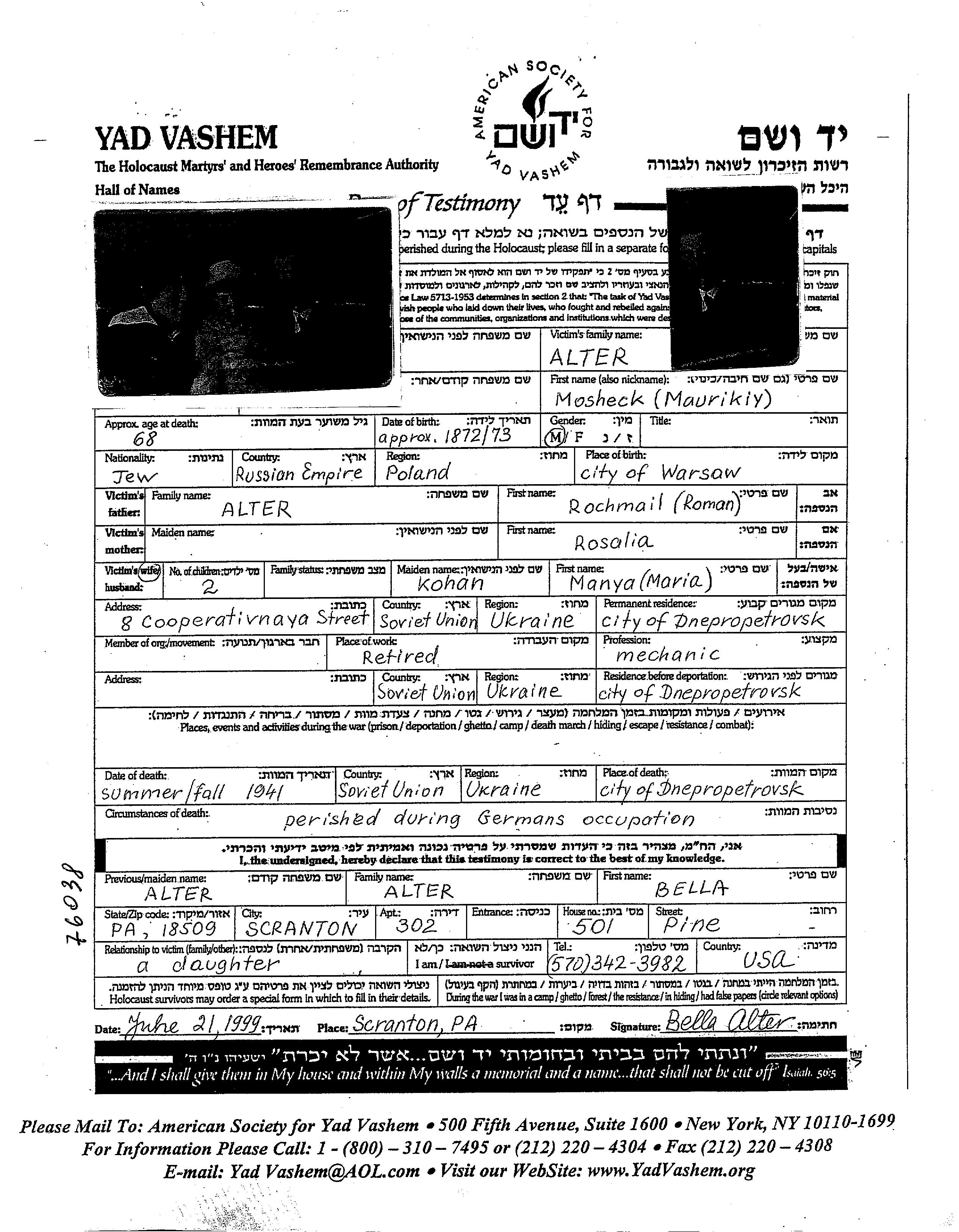 Mosheck Maurikiy Alter wurde im Jahr 1873 in Warszawa, Polen geboren. Er war Mechaniker/-in. Vor dem Zweiten Weltkrieg lebte er in Dnepropetrovsk, Ukraine (UdSSR).