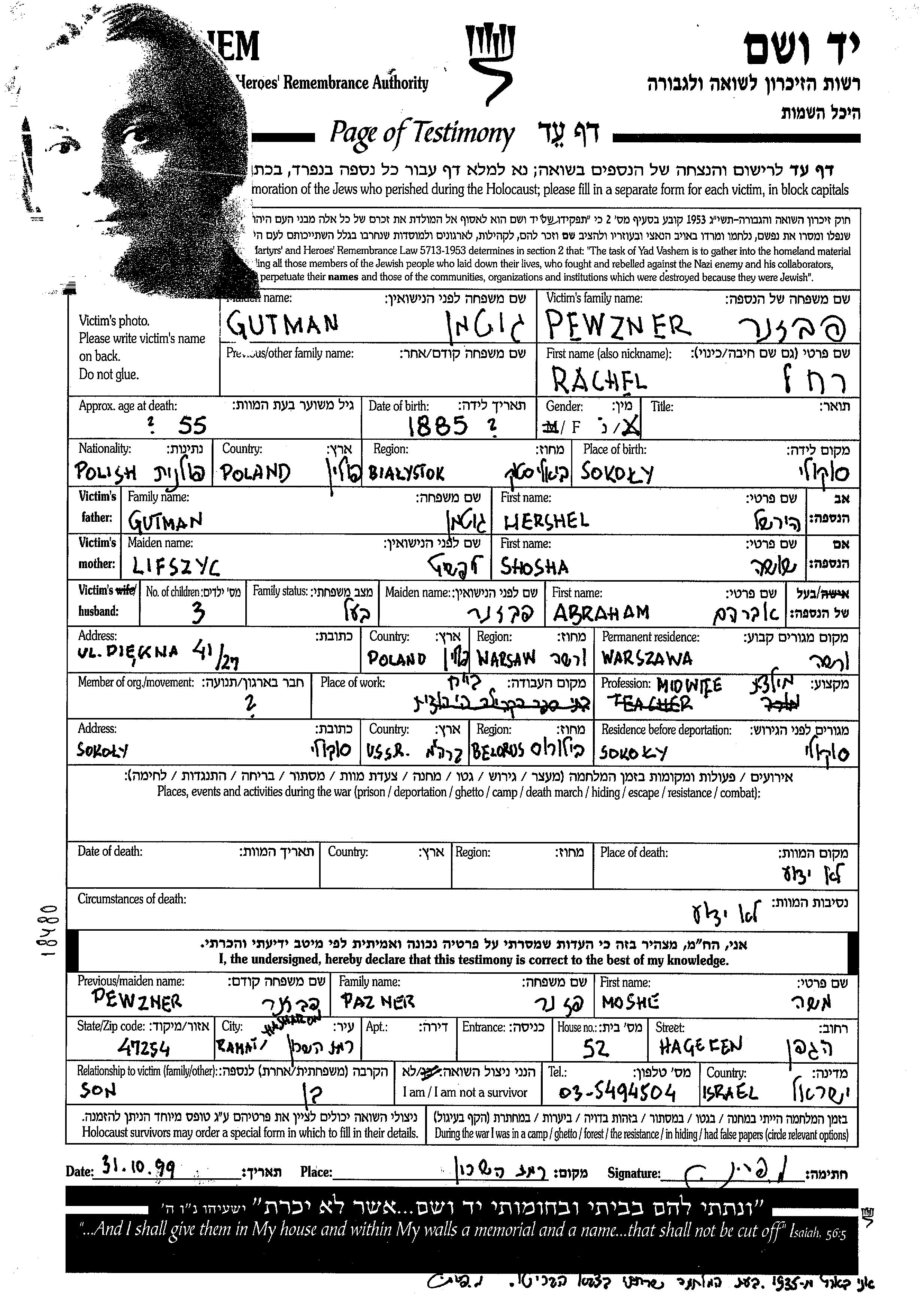 Rachel Gutman, geb. Pewzner wurde im Jahr 1885 in Sokoly, Polen geboren. Sie war Hebamme. Vor dem Zweiten Weltkrieg lebte sie in Warszawa, Polen.