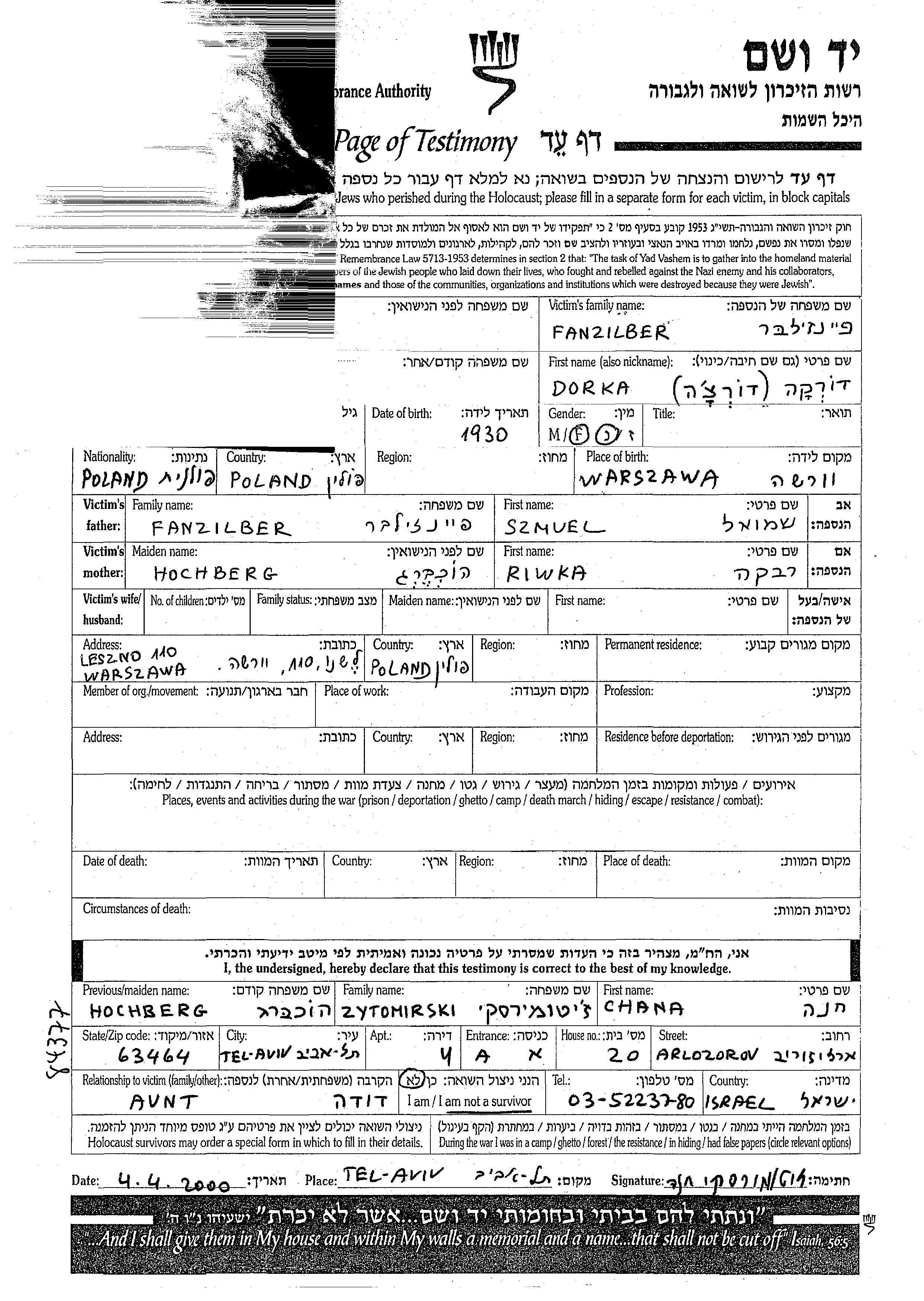 Dorka Dvora Fanzilber wurde im Jahr 1930 in Warszawa, Polen geboren. Vor dem Zweiten Weltkrieg lebte sie in Warszawa, Polen.
