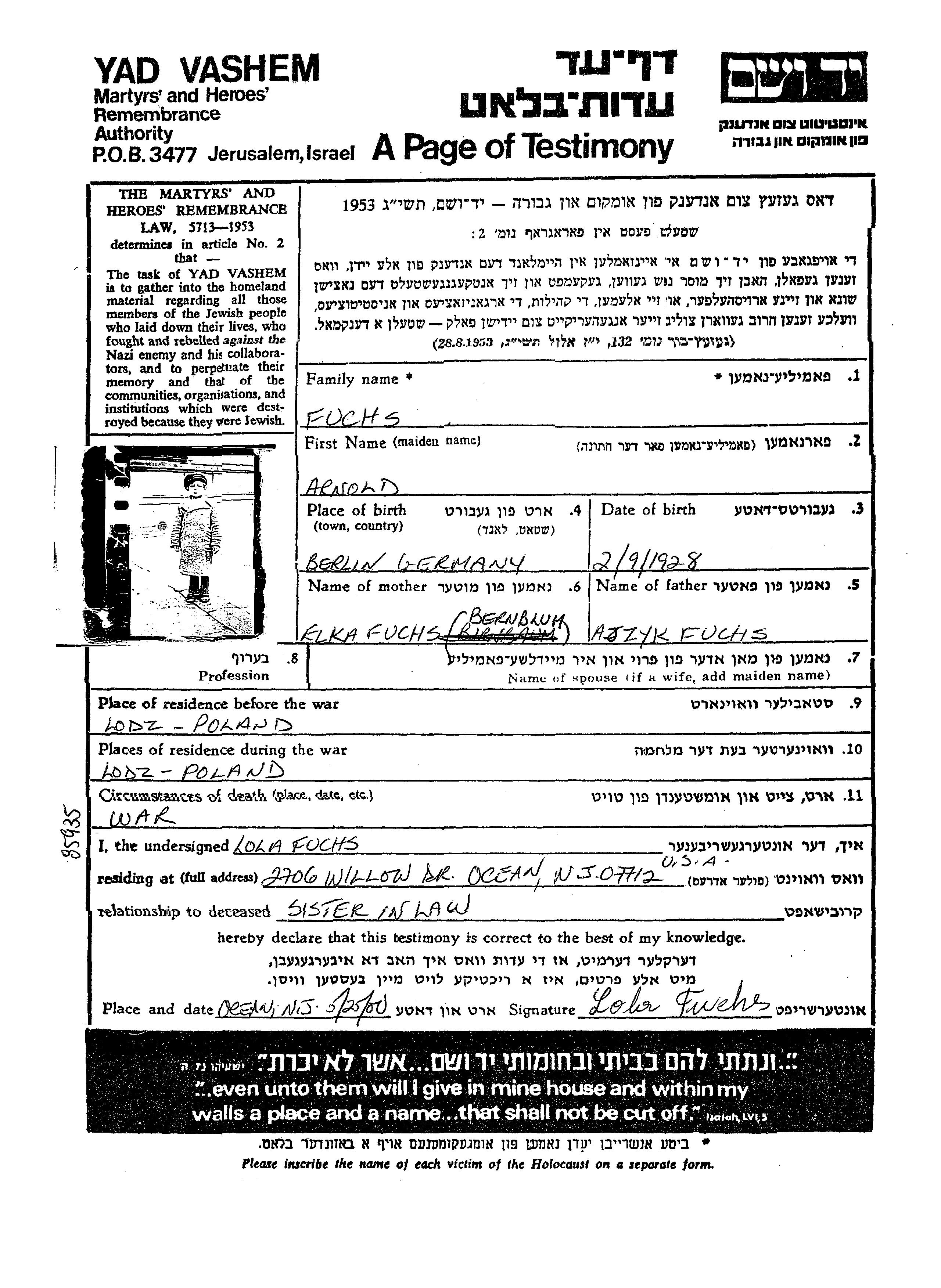 Fuchs Bernblum Arnold 1928 Lodz, Polen Gedenkblatt