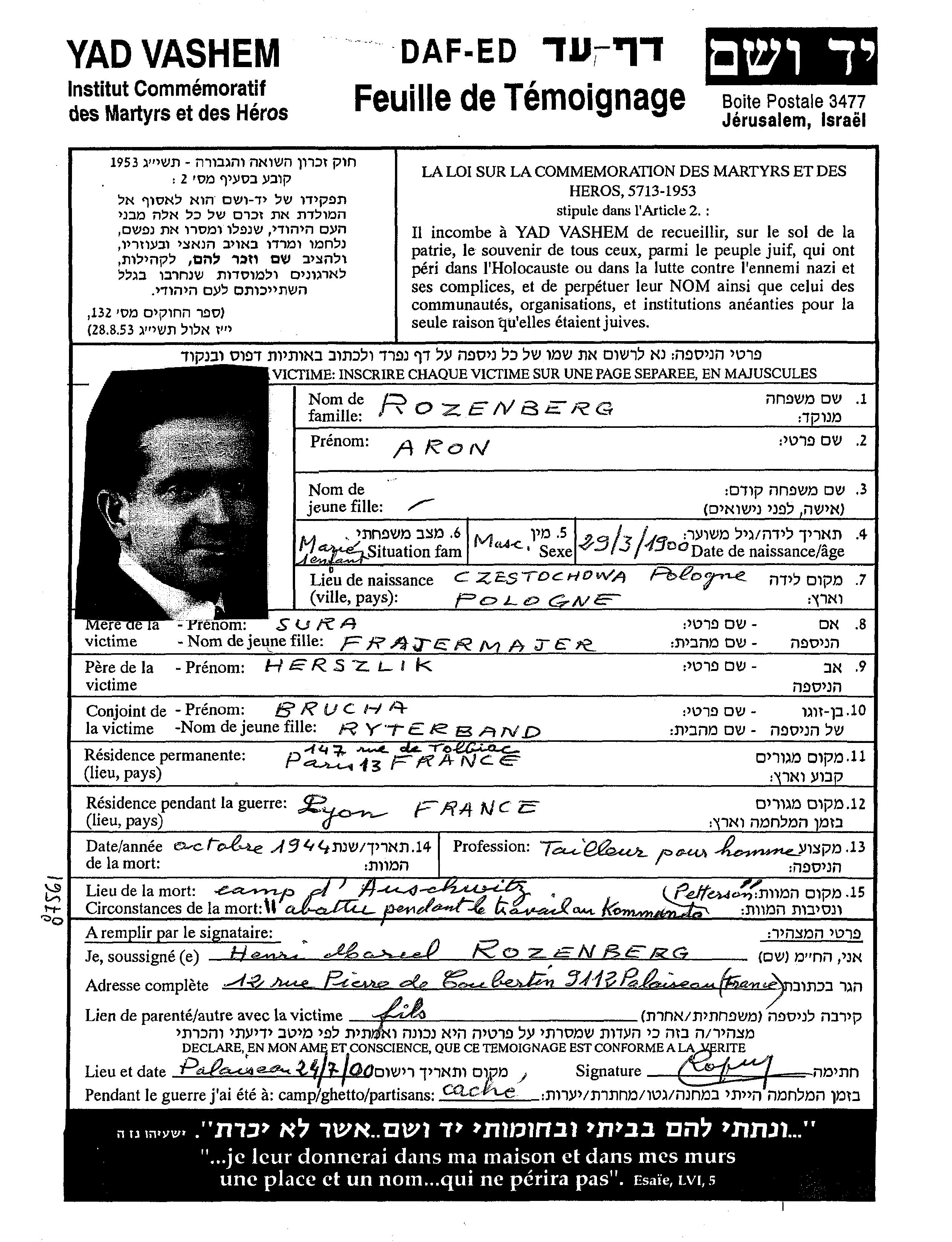 Aron Rozenberg wurde im Jahr 1900 in Czestochowa, Polen geboren. Er war Schneider. Vor dem Zweiten Weltkrieg lebte er in Paris, Frankreich.