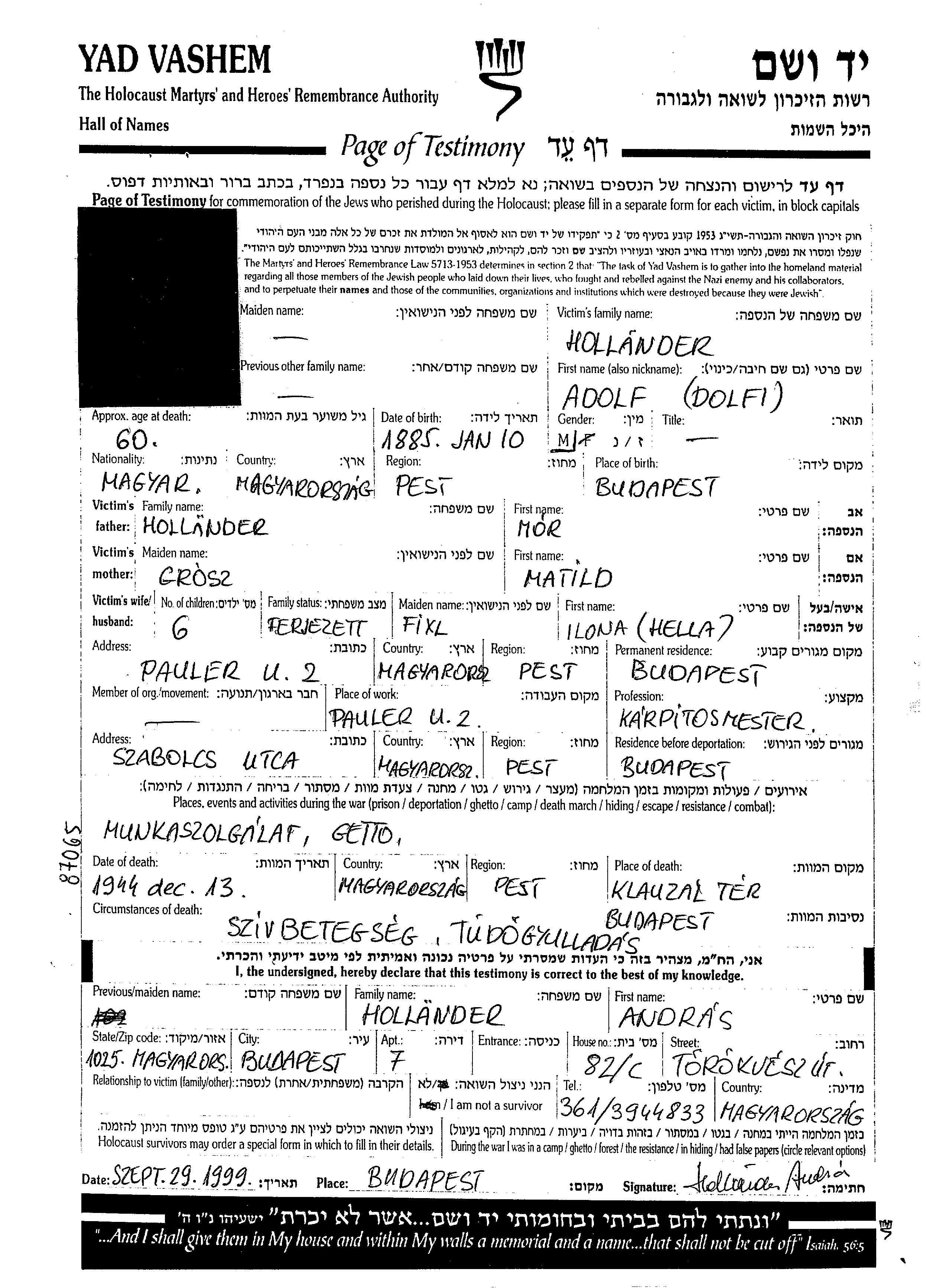 Hollander Adolf 1885 Budapest, Ungarn Aufzeichnungen ueber verfolgte Personen