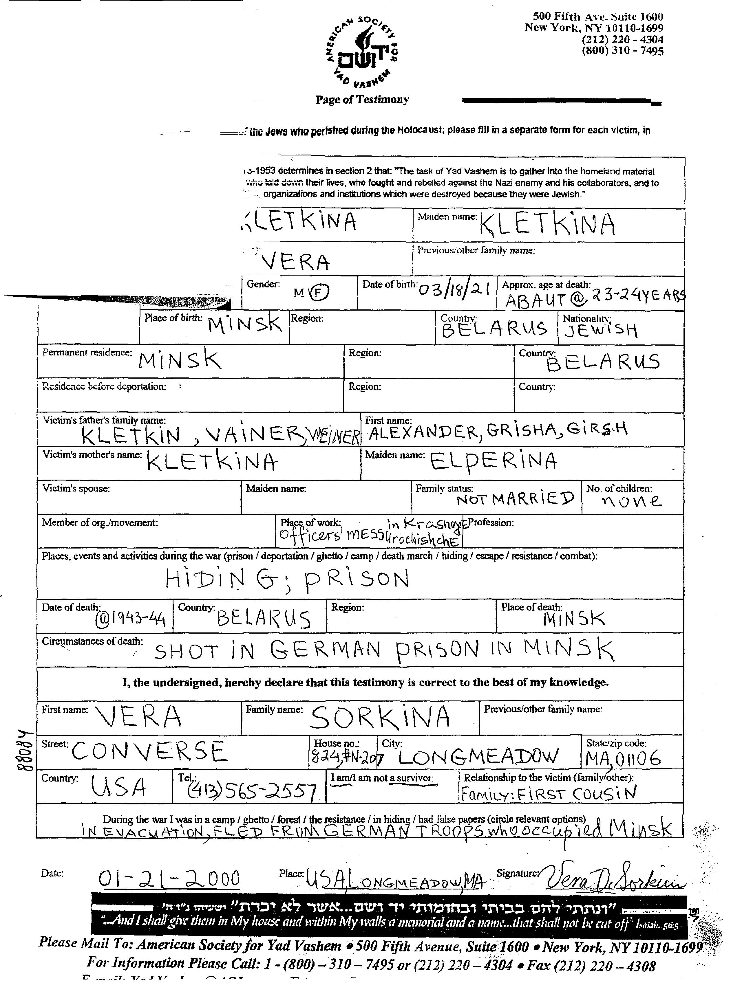 Kletkina | Vera | 1921 | Minsk, Weißrussland (UdSSR) | Gedenkblatt |
