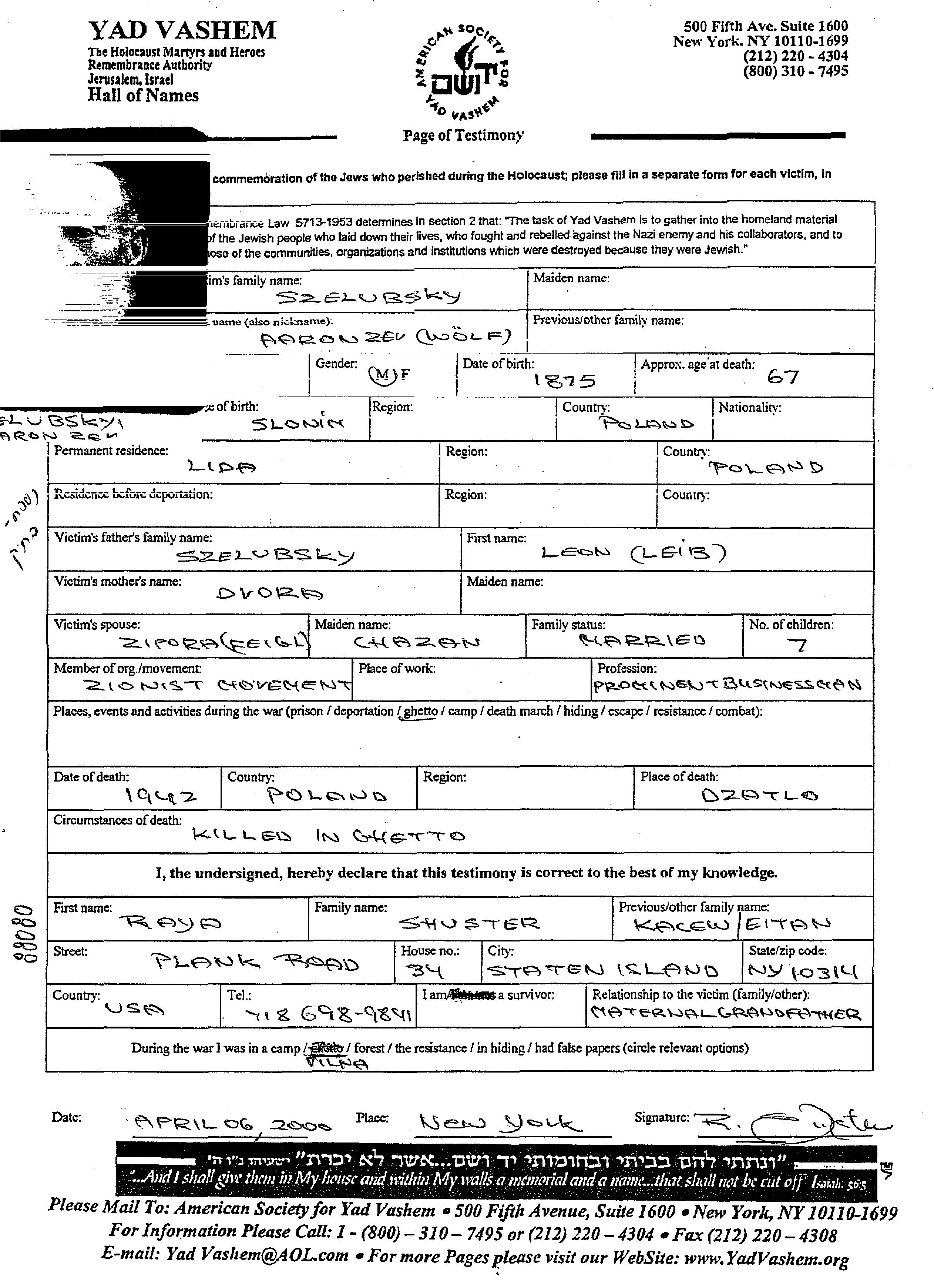 Aaron Zeev Wolf Szelubsky wurde im Jahr 1875 in Slonim, Polen geboren. Er war Geschäftsmann. Vor dem Zweiten Weltkrieg lebte er in Lida, Polen.