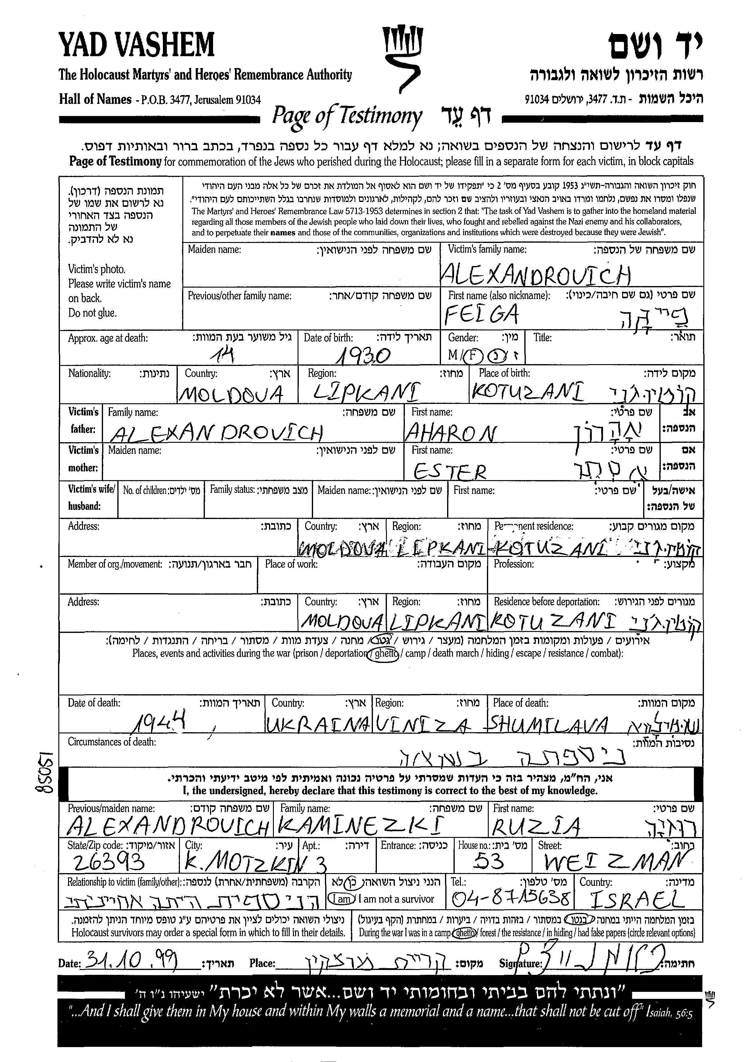 | Alexandrovich | Feiga | 1930 | Cotiugeni, Rumänien | Gedenkblatt |