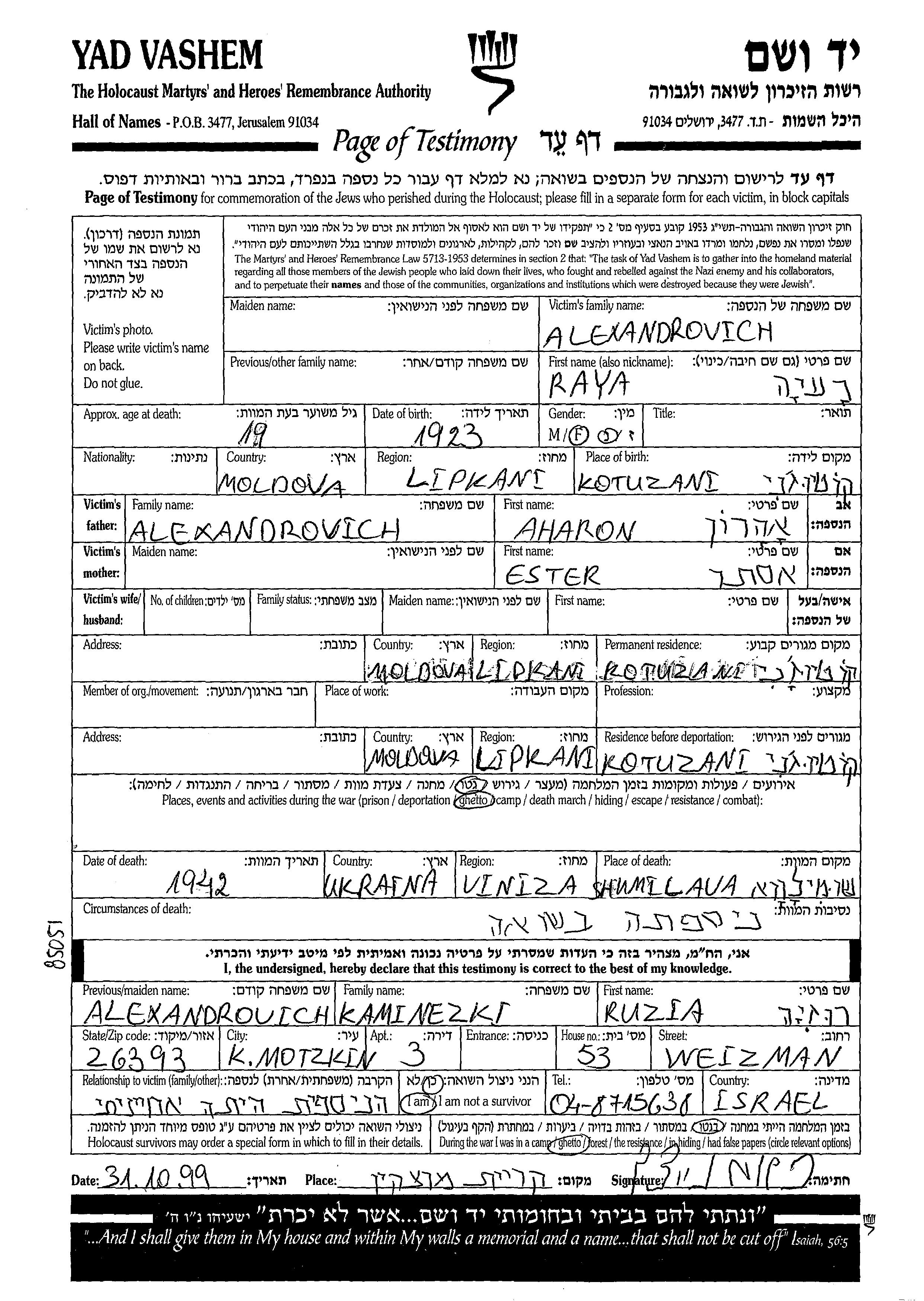 Raya Alexandrovich wurde im Jahr 1923 in Cotiugeni, Rumänien geboren. Vor dem Zweiten Weltkrieg lebte sie in Cotiugeni, Rumänien.