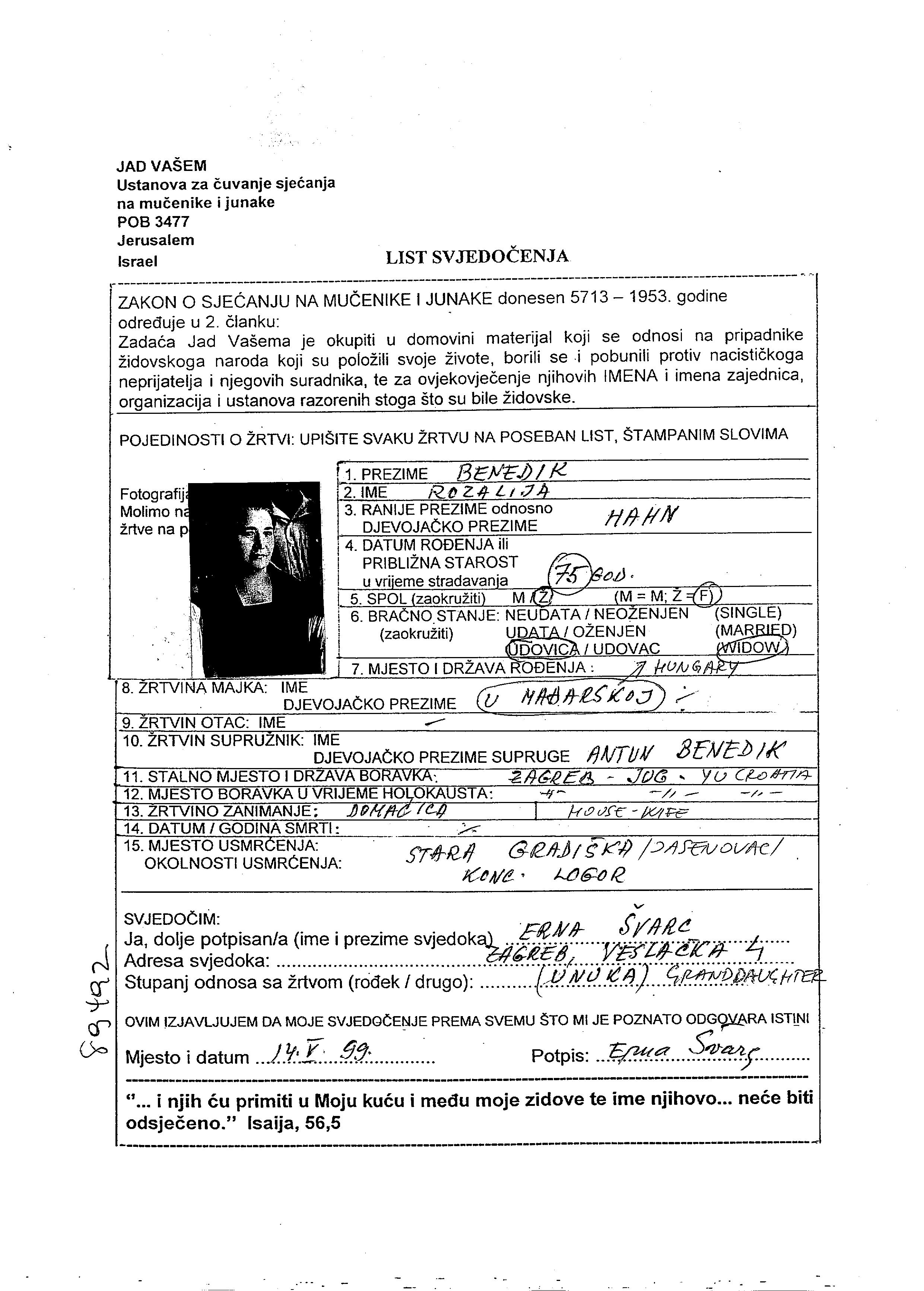 Rozalija Benedik, geb. Hahn wurde in Ungarn geboren. Sie war Hausfrau. Vor dem Zweiten Weltkrieg lebte sie in Zagreb, Jugoslawien.