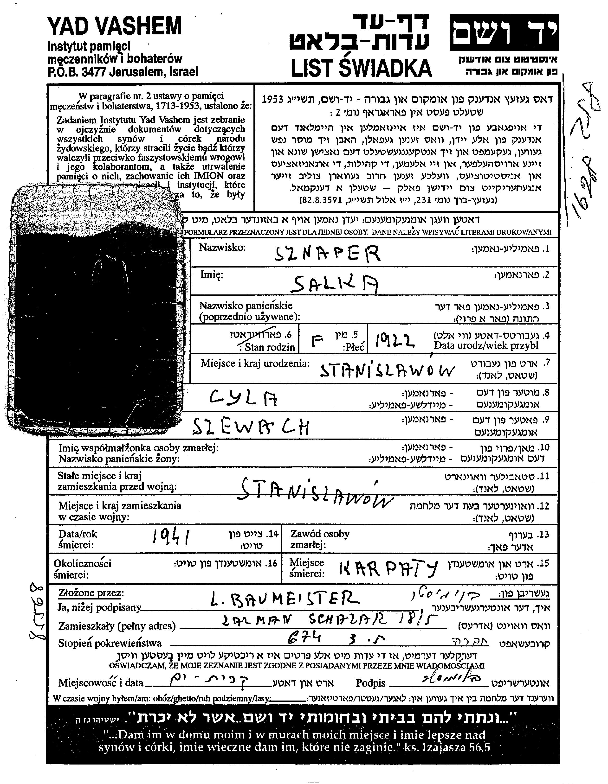 Sznaper | Salka | 1922 | Stanislawow, Polen | Gedenkblatt |