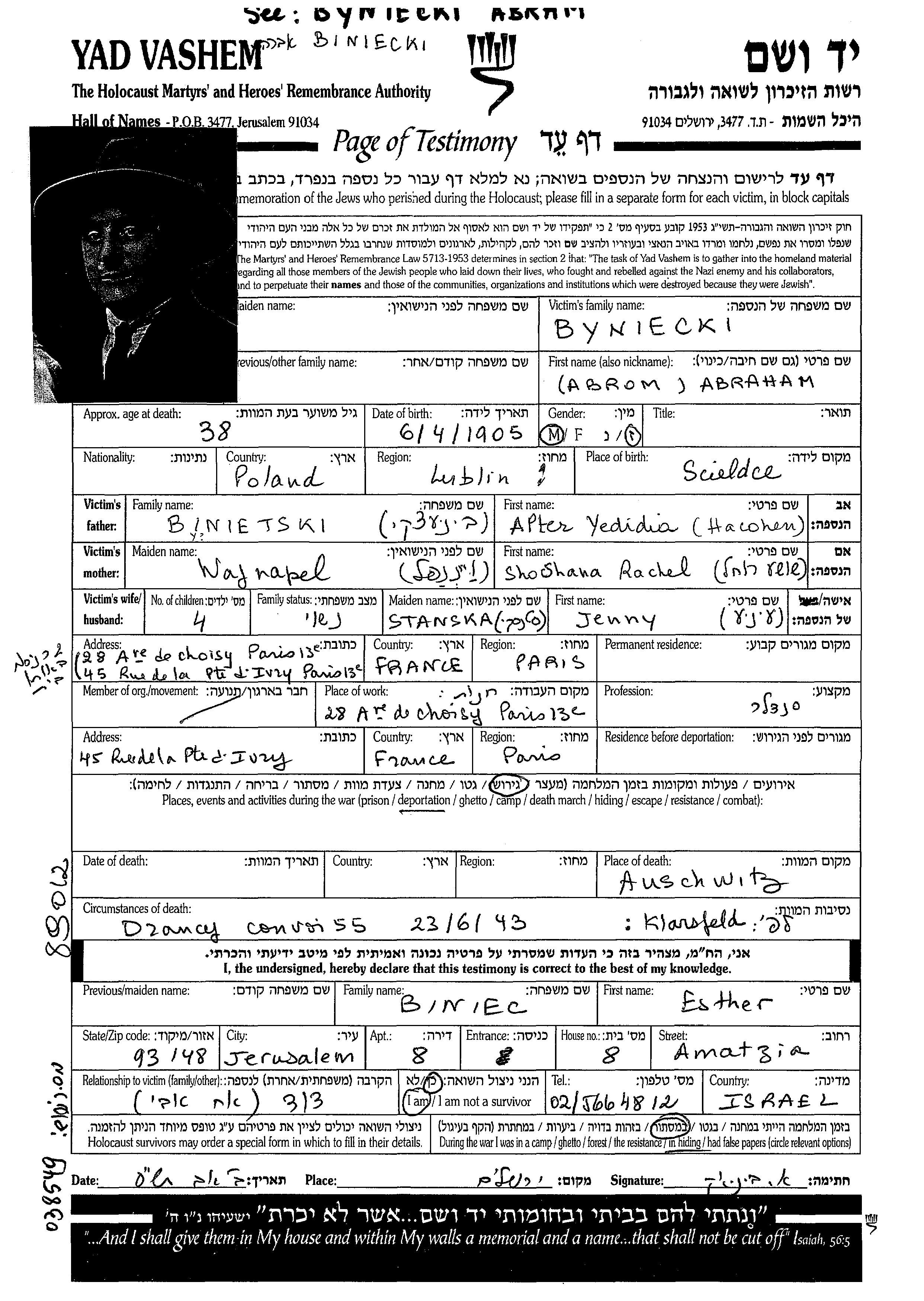 Abrom Byniecki Hacohen wurde im Jahr 1905 in Siedlce, Polen geboren. Er war Schuster/-in. Vor dem Zweiten Weltkrieg lebte er in Paris, Frankreich.