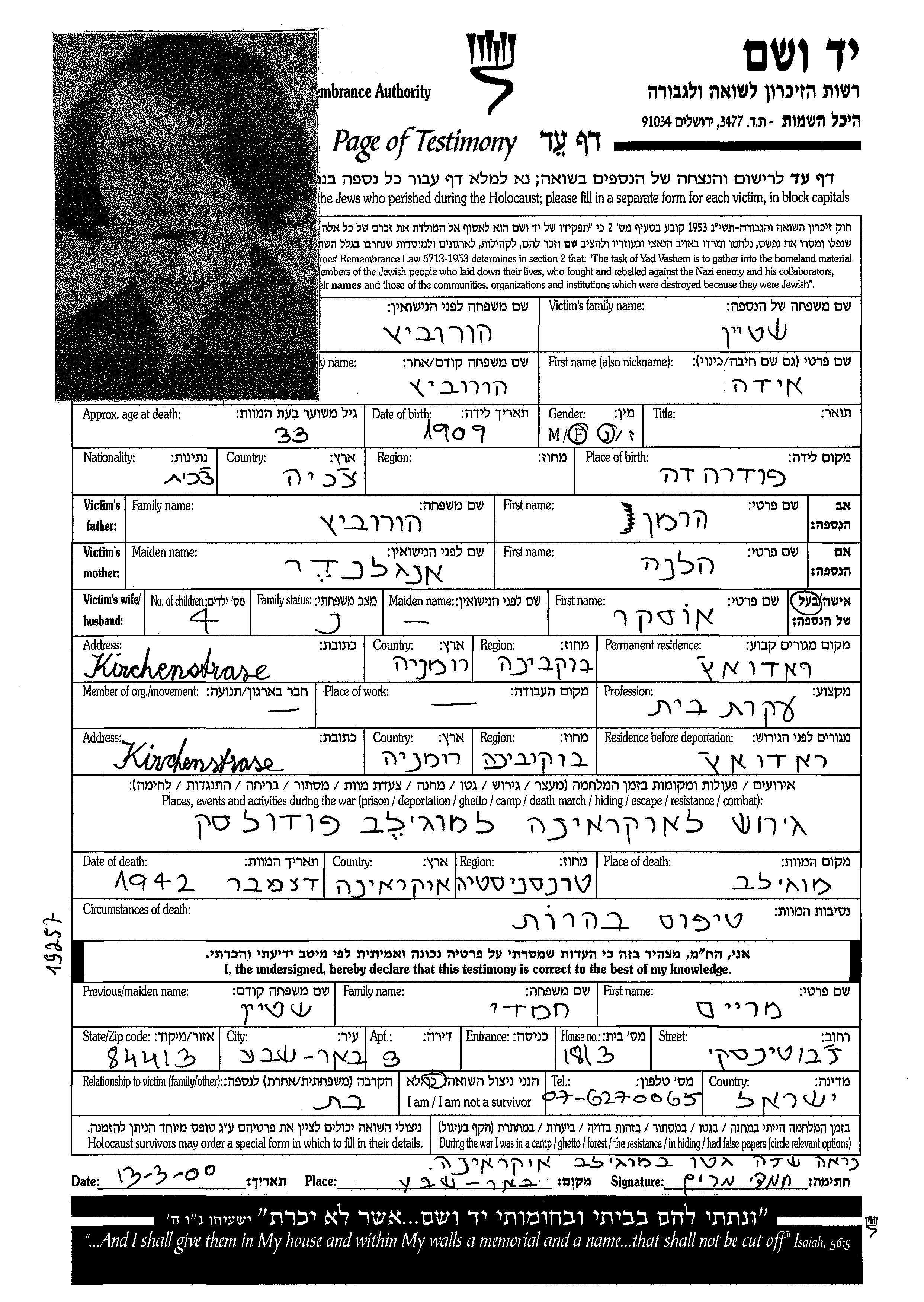 Ida Shtein, geb. Horovitz wurde im Jahr 1909 in Podhradie, Tschechoslowakei geboren. Sie war Hausfrau. Vor dem Zweiten Weltkrieg lebte sie in Radauti, Rumänien.